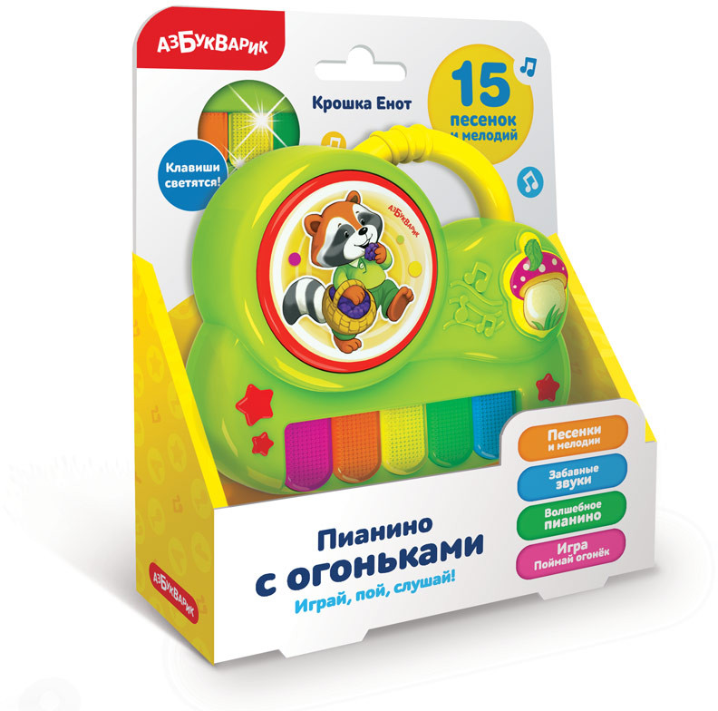 Азбукварик Игрушка музыкальная «Крошка eнот»В данный момент этот товар отсутствует в продаже. Возможно, у нас найдется аналогичный или похожий товар здесь. Серия: Пианино с огоньками С этим чудо-пианино каждый ребенок почувствует себя настоящим музыкантом! Нажимая на разноцветные клавиши, малыш послушает веселые песенки и мелодии («Антошка», «Улыбка», «Добрый жук», «Танец маленьких утят», «Чижик-пыжик» и другие), и даже сыграет сам 5 популярных мелодий. А до чего же интересно ловить на клавишах огоньки! Эта игра не только развлекает, но и развивает внимание, скорость реакции, мышление. |