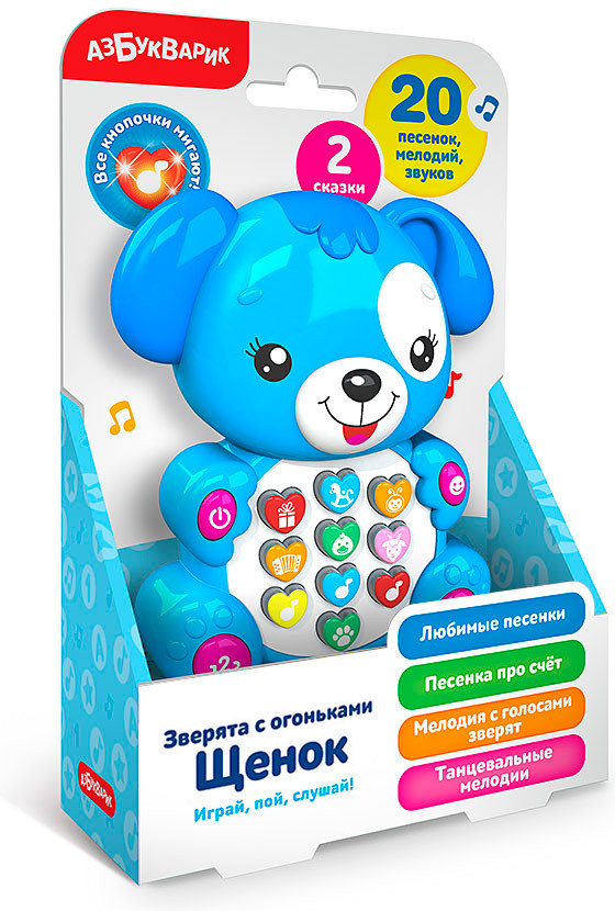 Азбукварик Игрушка музыкальная «Щенок»В данный момент этот товар отсутствует в продаже. Возможно, у нас найдется аналогичный или похожий товар здесь. Серия: Зверята с огоньками Малыш обязательно подружится с этим милым щенком! Игрушку отличает разнообразное содержание: вместе с ней ребёнок будет петь любимые песенки и потешки («Пусть бегут неуклюже», «Весёлая карусель», «Добрый жук», «Антошка», «Два весёлых гуся», «Идёт коза рогатая»), танцевать под весёлые мелодии, слушать сказки («Колобок», «Гуси-лебеди») и даже выучит счет до пяти с обучающей песенкой! Таким образом, игрушка не только развлекает малыша, но и развивает его музыкальные и танцевальные способности, расширяет кругозор. |