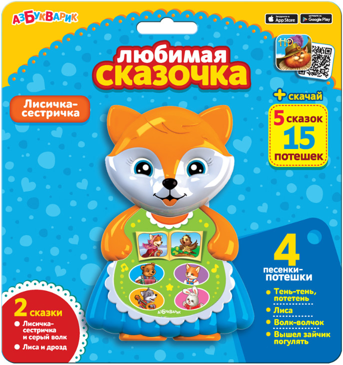 Азбукварик Игрушка музыкальная «Лисичка-сестричка»В данный момент этот товар отсутствует в продаже. Возможно, у нас найдется аналогичный или похожий товар здесь. Серия: Любимая сказочка Современная интерактивная игрушка из серии «Любимая сказочка» выполнена в виде лисички, персонажа русских народных сказок. Игрушка порадует ребенка своим привлекательным внешним видом и интересным содержанием. Малыш с удовольствием будет нажимать картинки-кнопочки, слушать русские народные сказки «Лисичка-сестричка и серый волк», «Лиса и дрозд» и милые потешки: «Тень-тень, потетень», «Лиса», «Волчек-волчек», «Вышел зайчик погулять». Игрушка небольшого размера, поэтому ее удобно брать с собой, а форма игрушки позволяет использовать ее и в сюжетной игре. |