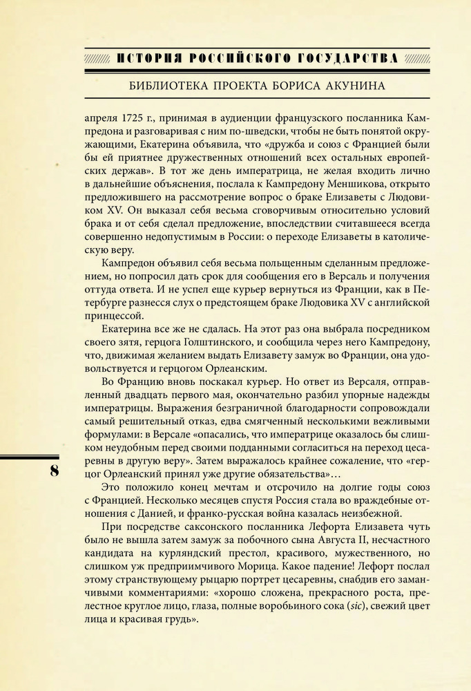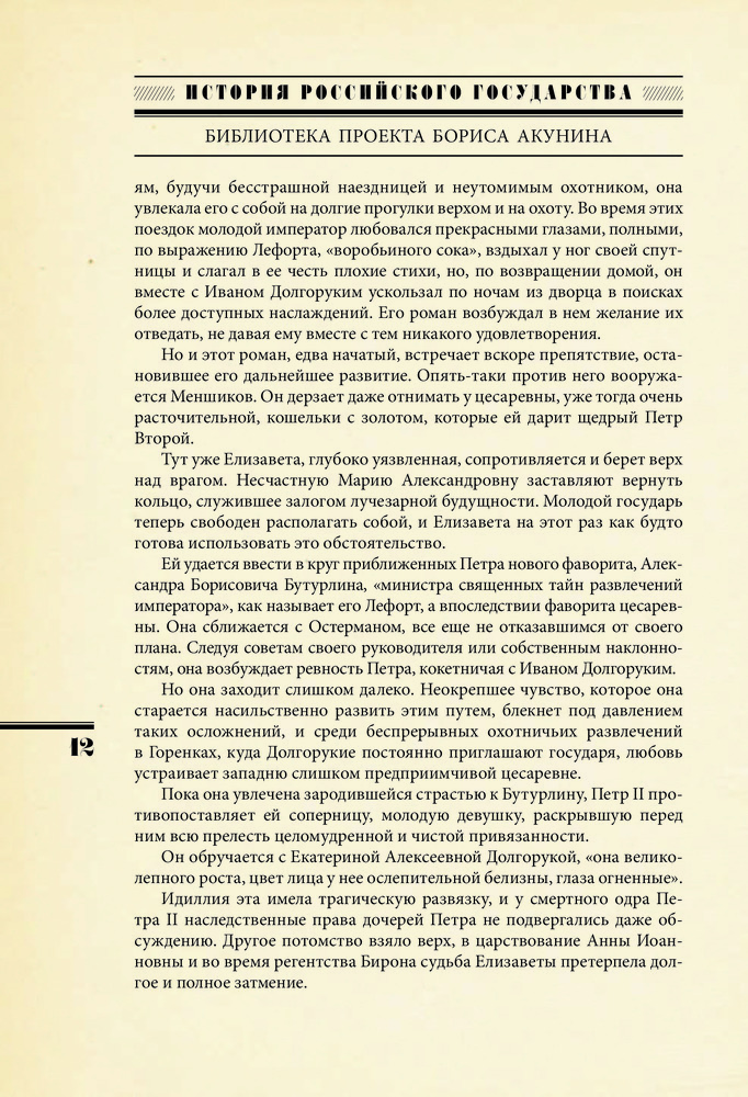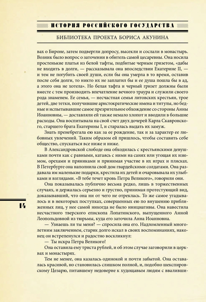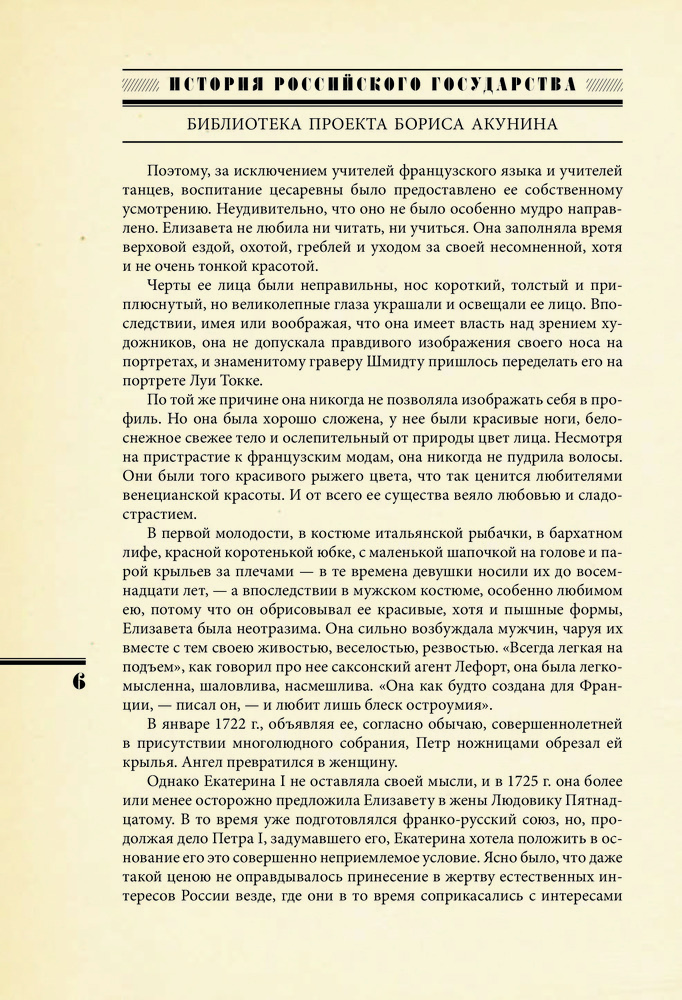 В данный момент этот товар отсутствует в продаже. Возможно, у нас найдется аналогичный или похожий товар здесь. Серия: Библиотека проекта Бориса Акунина «История Российского государства» Библиотека проекта «История Российского государства» — это рекомендованные Борисом Акуниным лучшие памятники исторической литературы, в которых отражена биография нашей страны от самых ее истоков. Елизавета I Петровна — блистательная всероссийская императрица, младшая, любимая дочь Петра Великого, продолжившая его политический курс. Период ее правления считается самым благополучным в истории страны. Громкие победы русского оружия заставили говорить о Елизавете как о «вершительнице европейских судеб» и вернули России утерянный после смерти Петра I статус великой державы. |