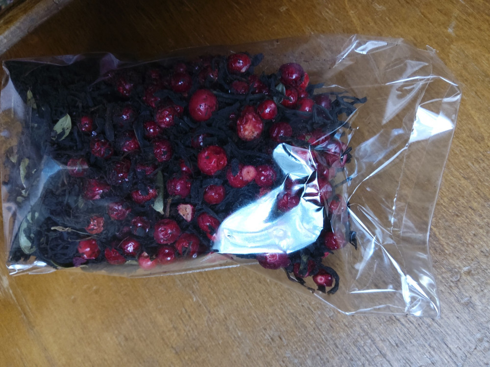 Нам понравился аромат и в принципе чай отличный. Внутри целые ягодки брусники.
