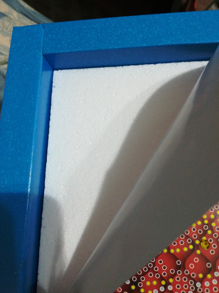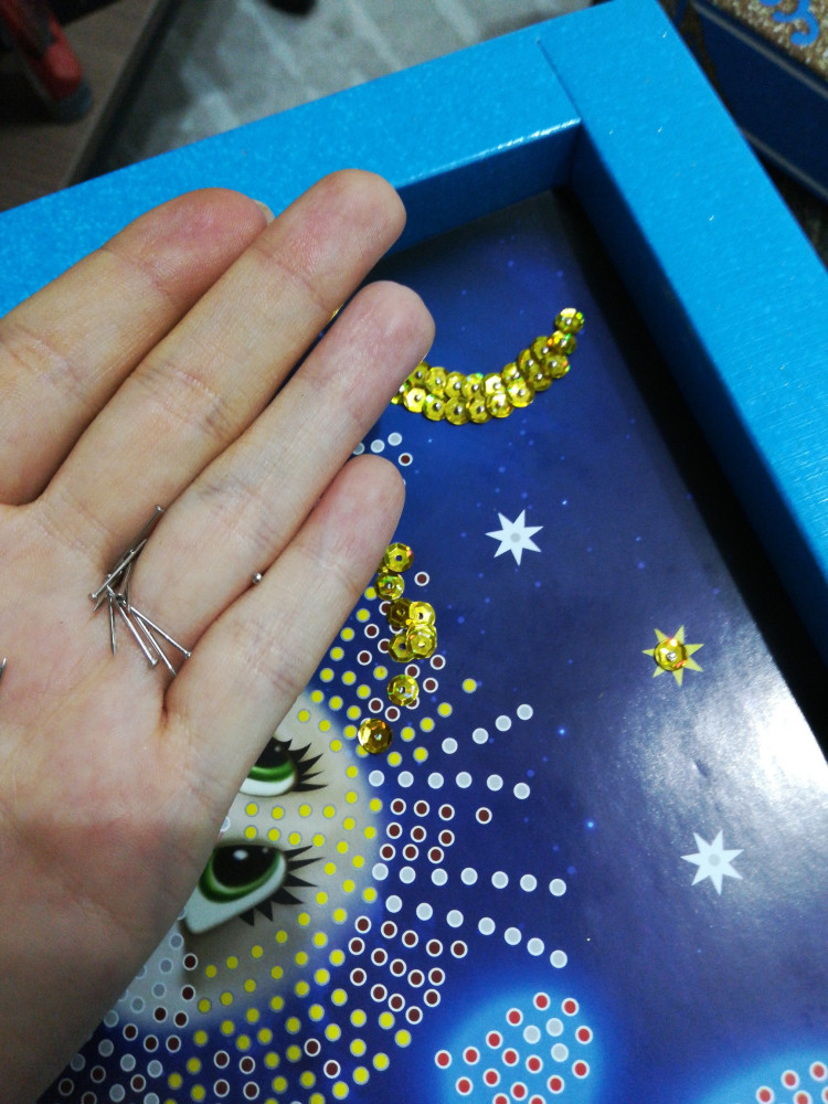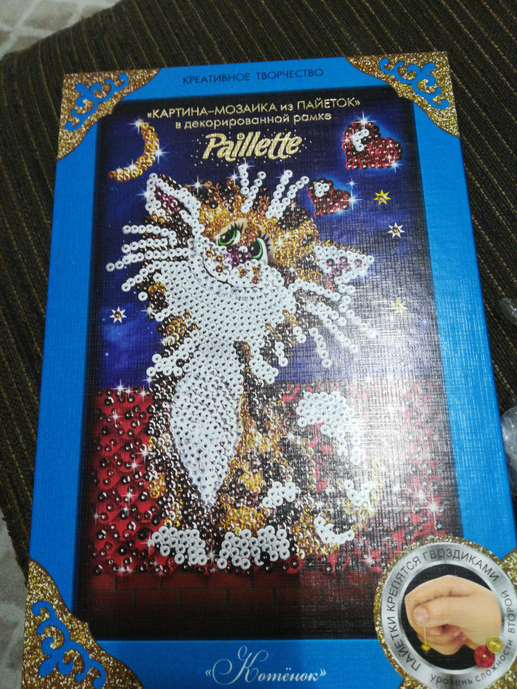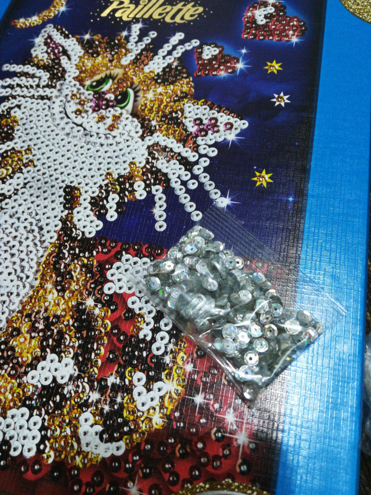 Картинка не соответствует вообще, поэтому разочарование. Если бы картинка устраивала то набор отличный для творчества. В коробке кусок пенопласта, поверх которого крепится картинка схема. Указаны места крепления пайеток, которые необходимо крепить гвоздиками. Не хватает для удобства пинцет, так как паетки постоянно переворачиваются. Также в данном наборе вместо белых пайеток серебристые.
