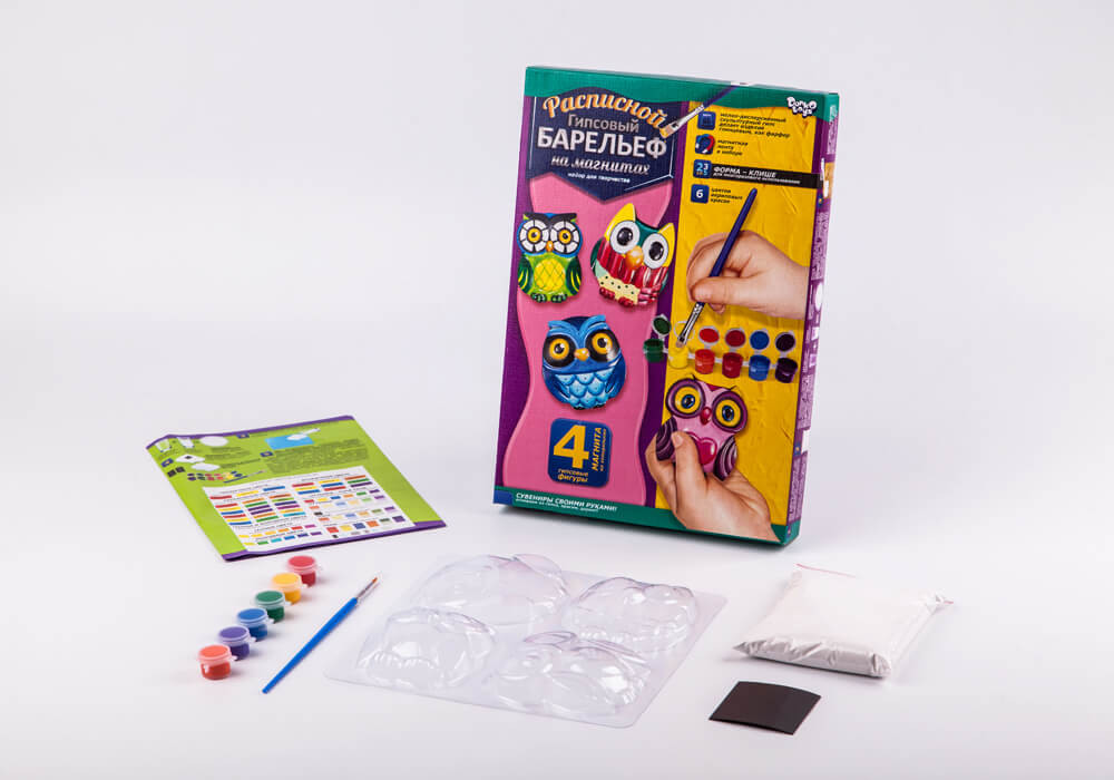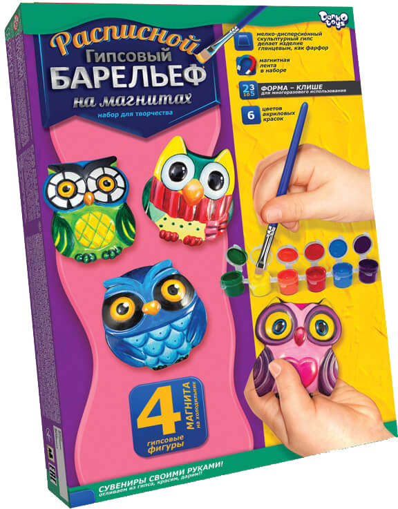 Перед Вами расписной гипсовый барельеф, который позволит изготовить четыре гипсовые фигурки на магнитах. Маленький набор для творчества содержит мелкодисперсный скульптурный гипс, который делает изделие глянцевым, как фарфор. Имеется также прозрачная полимерная форма-клише подходит для многоразового использования. Палитра из 6 цветов акриловых красок поможет сделать свою работу по-настоящему особенной. Ведь 4 магнита на холодильник своими руками могут стать отличными сувенирами или занять почетное место в Вашем интерьере.