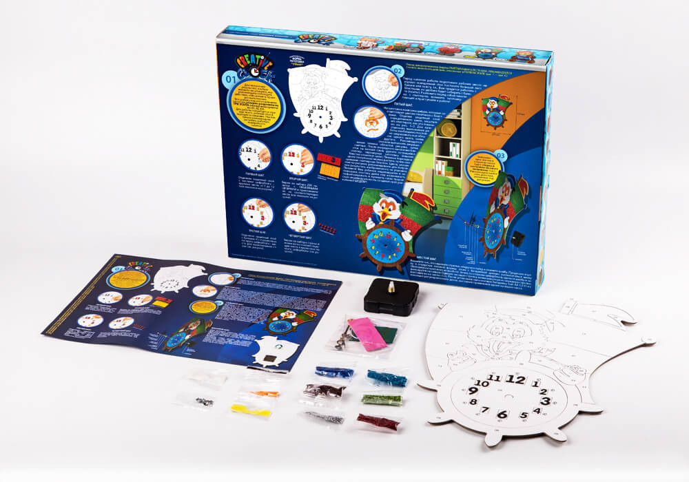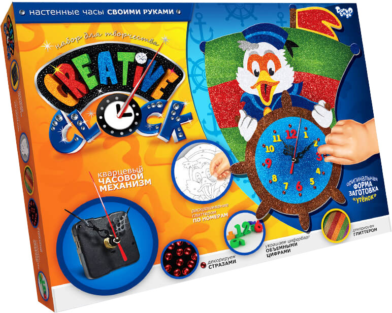Набор для творчества «Утёнок» из серии Creative clock от компании «Данко Тойс» подходит для творческих и любознательных детей. Им предстоит разукрасить контуры медведя и его бочонок меда и сделать циферблат. В конце часы среднего размера следует украсить стразами и установить сзади кварцевый часовой механизм. Настенные часы, сделанные своими руками, можно повесить в игровой комнате.
