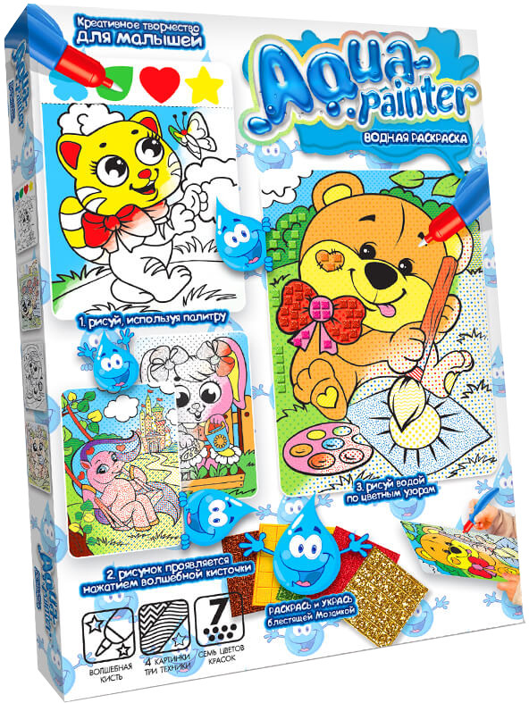 Aqua Painter — это уникальный набор начинающего художника! На картинки с контурами нанесена специальная краска, которая «активируется» с помощью воды, а «волшебная кисточка», заправляемая водой не требует специальной емкости и рисует нажатием! Разве не волшебство? Начните рисовать с нашим набором и у Вашего малыша непременно откроется дар начинающего художника. Старайтесь и развивайтесь!