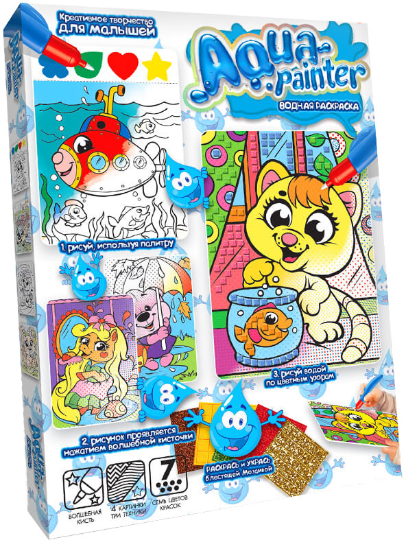 Aqua Painter — это уникальный набор начинающего художника! На картинки с контурами нанесена специальная краска, которая «активируется» с помощью воды, а «волшебная кисточка», заправляемая водой не требует специальной емкости и рисует нажатием! Разве не волшебство? Начните рисовать с нашим набором и у Вашего малыша непременно откроется дар начинающего художника. Старайтесь и развивайтесь!