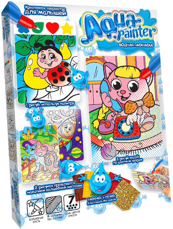 Aqua Painter — это уникальный набор начинающего художника! На картинки с контурами нанесена специальная краска, которая «активируется» с помощью воды, а «волшебная кисточка», заправляемая водой не требует специальной емкости и рисует нажатием! Разве не волшебство? Начните рисовать с нашим набором и у Вашего малыша непременно откроется дар начинающего художника. Старайтесь и развивайтесь!