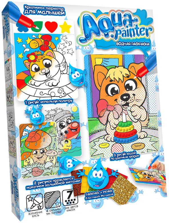 Aqua Painter — это уникальный набор начинающего художника! На картинки с контурами нанесена специальная краска, которая «активируется» с помощью воды, а «волшебная кисточка», заправляемая водой не требует специальной емкости и рисует нажатием! Разве не волшебство? Начните рисовать с нашим набором и у Вашего малыша непременно откроется дар начинающего художника. Старайтесь и развивайтесь!