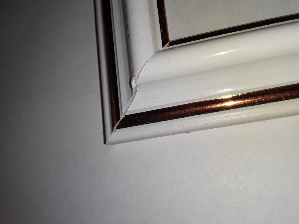 Не совсем довольна рамкой. Золотистая вставка практически полностью перечеркнула серебро. Хотя и смотрится симпатично. Качество самой рамки хорошее.