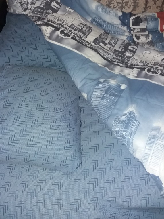Качество хорошее. Материал плотный. Расцветка немного смотрится не как на картинке (на картинке смотрится, как потертая джинса)Но, в общем, комплект понравился, хороший.