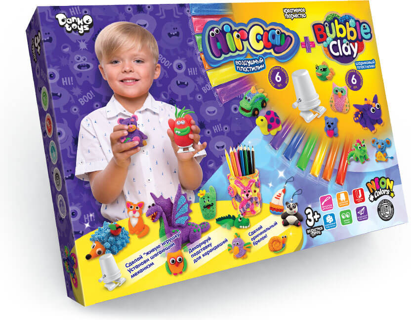 «Bubble Clay» — это шариковый пластилин улучшенной формулы. Он состоит из маленьких пенопластовых шариков, скрепленных между собой клеевым составом. Детали очень легко присоединяются друг к другу, достаточно просто приложить одну к другой и они склеятся без малейших усилий. При высыхании фигурки из шарикового пластилина твердеют и остаются милыми забавными игрушками.