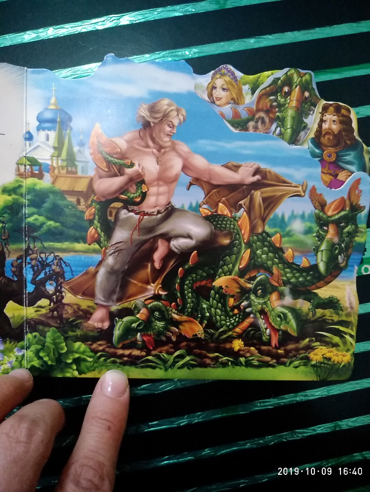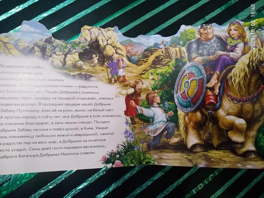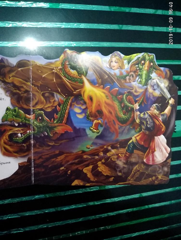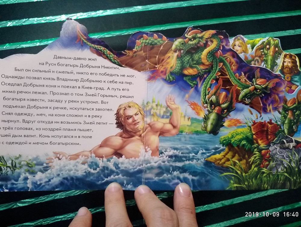 Картонная книжка. Рисунки яркие, красивые. Шрифт мелкий. Хотела сына познакомить с русскими героями и чудовищами. Так сказать, для расширения кругозора. Ему почти 2 г., книжка понравилась. Формат книги интересный, с вырубкой, такой у нас не было еще. Конечно, для нас рановато, но я не считаю это лишним. Что-то да и отложится. Тут и трехголовый змей, и богатыри, и кузнецы, кующие мечи, одежда богатыря. В общем, есть тема для обсуждения.