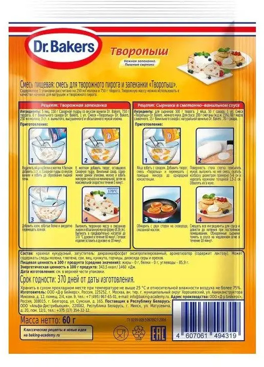 Dr. Bakers Смесь для творожного пирога, сырников и запеканки «Творопыш»+20 пышность подходит для сырников структура неудовлетворительный результат