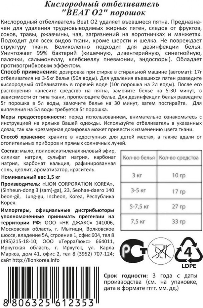 Вторую упаковку заказала осознанно, отбеливает замечательно, как белое так и цветное, с пятнами справляется на отлично, белье имеющее пожелтевший вид (пока кипятила только хб ткань) выбеливает и придаёт белоснежный цвет, Я промониторила наши корейские магазины- нет такого отбеливатель в наличии, так что спасибо большое Флипу за возможность покупки этого товара, а всем сомневающимся оооооочень рекомендую. Я часто пользуюсь отбеливателями и кислородными и «эко» и без хлора и с хлором, в общем разные фирмы пробовала не все меня устроили, этот просто находка! 👍