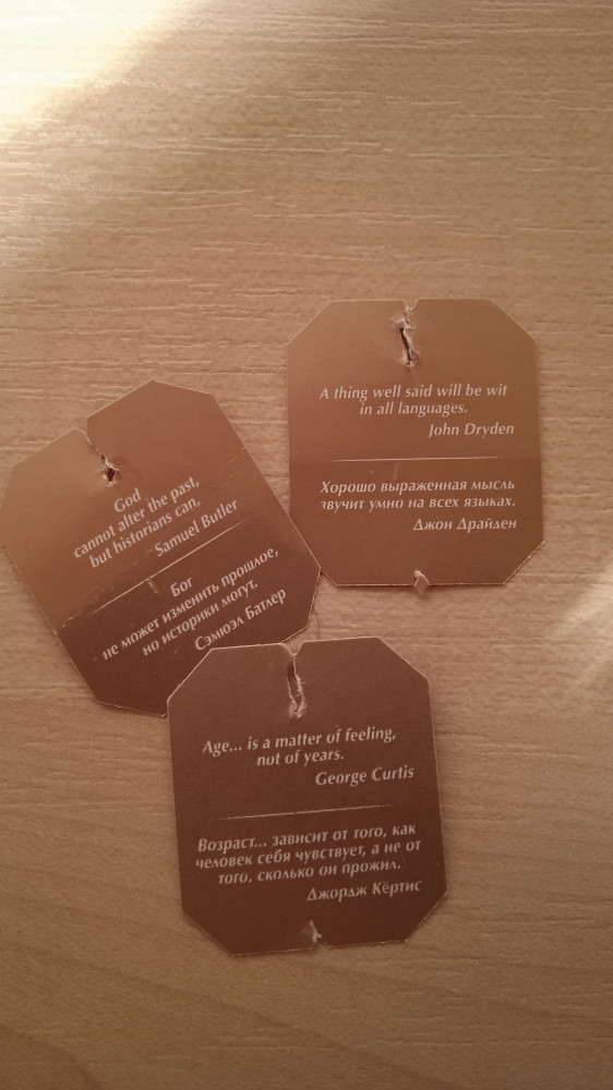 Дополняю свой отзыв. Чай настолько вкусным оказался, все в восторге. Плюс ко всему, на каждом ярлычке цитата великого человека, этого я не ожидала, так приятно стало, честно говоря. Ставлю 100 из 5 звезд :)