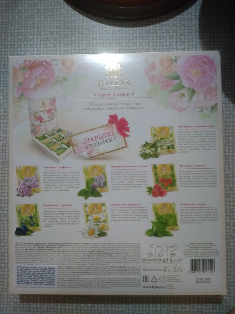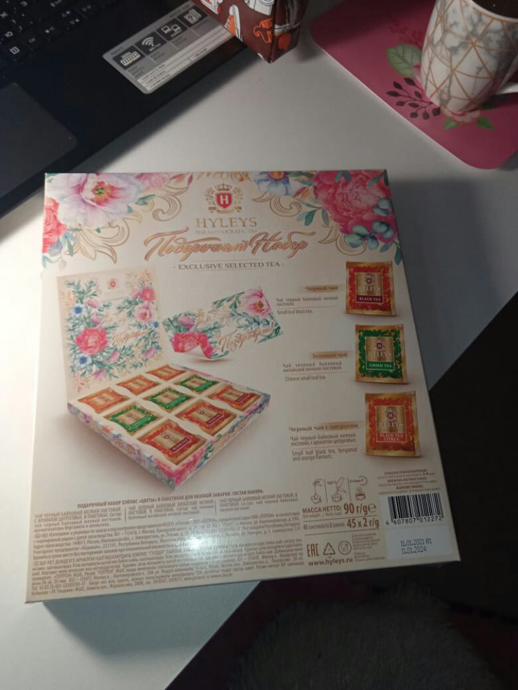 Дважды я сделала себе подарок чай "Подарочный набор " от Hyleys и была очень рада! Мне так понравилось красивое оформление! Эти цветы! Этот натуральный вкус натурального чая! Красиво упакованные каждые саше-пакетики! Для меня это был восторг и восхищение! Получила эстетическое и вкусовое удовольствие! Всегда ищу глазами на полочках супермаркетов заветную красивую коробочку чудесного чая!