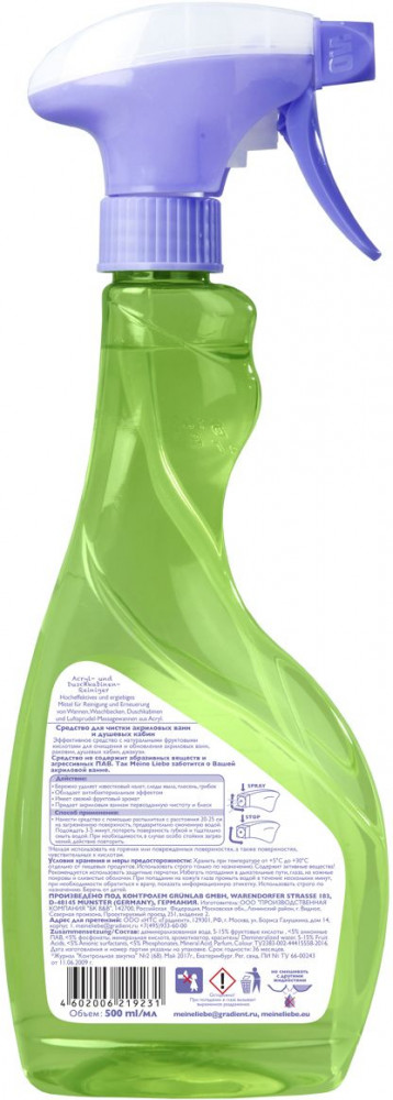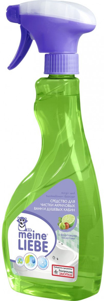 Meine liebe Средство для чистки акриловых ванн и душевых кабин-20% +60 хорошо очищает хорошая упаковка не берёт сильные загрязнения раздражает дыхательные пути