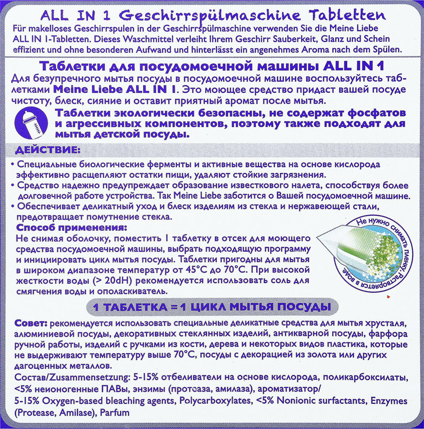 Meine liebe Таблетки для посудомоечной машины «All in 1»В данный момент этот товар отсутствует в продаже. Возможно, у нас найдется аналогичный или похожий товар здесь. Таблетки для мытья посуды в посудомоечной машине «All in 1» придадут вашей посуде чистоту, блеск, сияние и оставят приятный аромат после мытья. Специальные биологические ферменты и активные вещества на основе кислорода эффективно расщепляют остатки пищи, удаляют стойкие загрязнения. Средство надежно предупреждает образование известкового налета, способствуя более долговечной работе устройства. Обеспечивает деликатный уход и блеск изделиям из стекла и нержавеющей стали, предотвращает помутнение стекла. |