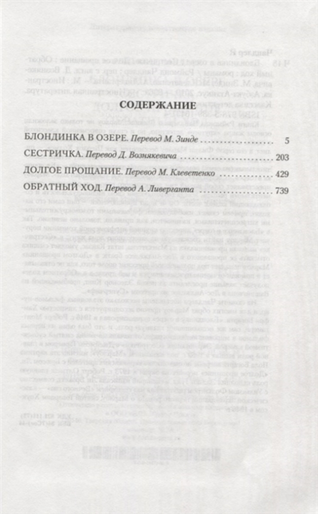 Четыре классических романа от «отца» жанра «крутой детектив» Рэймонда Чандлера под одной обложкой. Каждый роман хорош по своему, интрига и общее напряжение сохраняются в каждой, но переодически прерываются интерлюдиями в виде рефлексии главного героя (очень важный момент для понимания ценности персонажа и его культурного наследия. Именно отсюда растут ноги у Рика Декарда из «Бегущего по Лезвию», Гарри Энджела из «Сердца Ангела», Гарри Босха из цикла Коннелли и даже Жефа Костелло из фильма «Самурай» с Аленом Делоном) + каждый из романов умело демонстрирует новые грани modus operandi Филипа Марлоу - частного сыщика из Лос Анджелеса, центрального персонажа многих работ Чандлера и абсолютную икону жанра нуар, чей образ на экране был неоднократно воплощен великим Хэмфри Богартом (также как и «побратима» Марлоу - детектива Сэма Спейда из романов Дэшилла Хэммета. После чего Богарт стал восприниматься (и воспринимается по сей день) не иначе как олицетворение нуара). Два романа из этого сборника в дальнейшем были экранизированы (Долгое Прощание и Блондинка в озере, которая для экрана была переименована в Леди в Озере), и также стали нестареющей классикой «черного фильма». Хотя вот Глубокий Сон, оставшийся в предыдущем сборнике, так и вовсе, как мне думается, стал вершиной всего творческого пути Чандлера. Но хуже от этого данная книга не становится. Иными словами, всем желающим прикоснуться к самым корням - настоятельно рекомендую.
