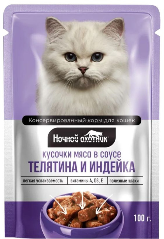 Ночной охотник Корм для кошек с телятиной и индейкой-20% +12 Хороший корм кошке понравился с удовольствием уличные коты рекомендовано не понравился
