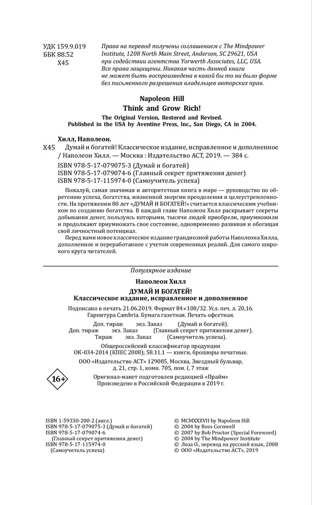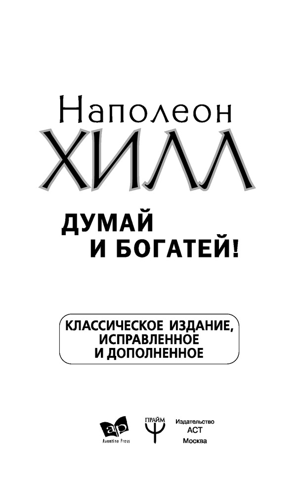 Думай и богатей! Самое полное издание, исправленное и дополненноемотивирует легко читается полезное содержание мягкий переплёт В данный момент этот товар отсутствует в продаже. Возможно, у нас найдется аналогичный или похожий товар здесь. Серия: Самоучитель успеха Пожалуй, самая значимая и авторитетная книга в мире — руководство по обретению успеха, богатства, жизненной энергии преодоления и целеустремленности. На протяжении 70 лет «Думай и богатей!» считается классическим учебником по созданию богатства. В каждой главе Наполеон Хилл раскрывает секреты добывания денег, пользуясь которыми, тысячи людей приобрели, приумножили и продолжают приумножать свое состояние, одновременно развивая и обогащая свой личностный потенциал. Перед вами новое классическое издание грандиозной работы Наполеона Хилла, дополненное и переработанное с учетом современных реалий. Для самого широкого круга читателей. |