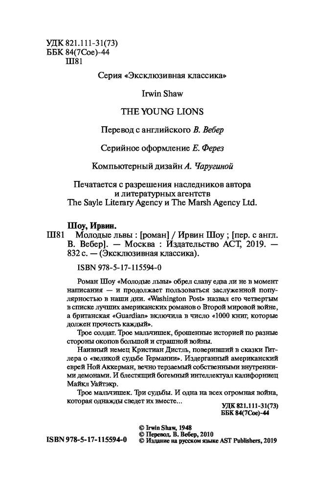 💳 Оплатить за товар можно при получении 🇰🇿 Есть бесплатная доставка по Казахстану от 1 дня 🎁 Копите бонусы с каждой покупки Серия: Эксклюзивная классика Роман Шоу «Молодые львы» обрел славу едва ли не в момент написания — и продолжает пользоваться заслуженной популярностью в наши дни. «Washington Post» назвал его четвертым в списке лучших американских романов о Второй Мировой войне, а британская «Guardian» включила в число «1000 книг, которые должен прочесть каждый». Трое солдат. Трое мальчишек, брошенных историей по разные стороны окопов большой и страшной войны. Наивный немец Кристиан Дистль, поверивший в сказки Гитлера о «великой судьбе Германии». Издерганный американский еврей Ной Аккерман, вечно терзаемый собственными внутренними демонами. И блестящий богемный интеллектуал-калифорниец Майкл Уайтэкр. Трое мальчишек. Три судьбы. И одна на всех огромная война, которая однажды сведет их воедино... |