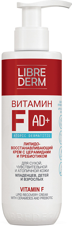 Атопичная кожа — особый тип кожи с нарушениями водного и липидного обмена, изменениями в работе сальных и потовых желез. Дефицит влаги и собственного себума в роговом слое приводит к повреждению защитного барьера кожи, и, как следствие, появляется ощущение стянутости, шелушение, повышенная реактивность, зуд, мелкие поверхностные морщинки, потеря упругости. Липодовосстанавливающий крем Витамин F с церамидами и пребиотиком рекомендуется для сухой, обезвоженной, атопичной и чувствительной кожи тела, склонной к шелушениям и раздражениям. Нормализует основные параметры сухой кожи: повышает уровень её увлажненности, восстанавливает целостность гидролипидного барьера, снижает потерю влаги, снимает повышенную чувствительность. Устраняет ощущение стянутости, возвращает коже комфорт, предотвращает образование сухости и трещин. Уже через 2 недели до трёх раз увеличивает гидратацию кожи, возвращая коже мягкость и здоровый вид. Восстанавливает и поддерживает баланс микрофлоры кожи. Рекомендован ведущими дерматологами как при моноуходе, так и в комплексной терапии атопического дерматита. Нежный, насыщенный крем легко распределяется по коже, быстро впитывается, питает и увлажняет кожу, мгновенно устраняя ощущение сухости и стянутости.