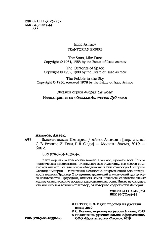 Наконец-то. Академия (основная трилогия) вышла лет 5 назад. Академия и Земля - почти следом за ней, но тираж был так мал, что ухватить её удалось только чудом. И вот "Галактическая Империя" (Транторианская Империя), - как пролог к основному циклу "Академия". Пять звёзд авансом. И лишний повод перечесть "Академию" еще разок.