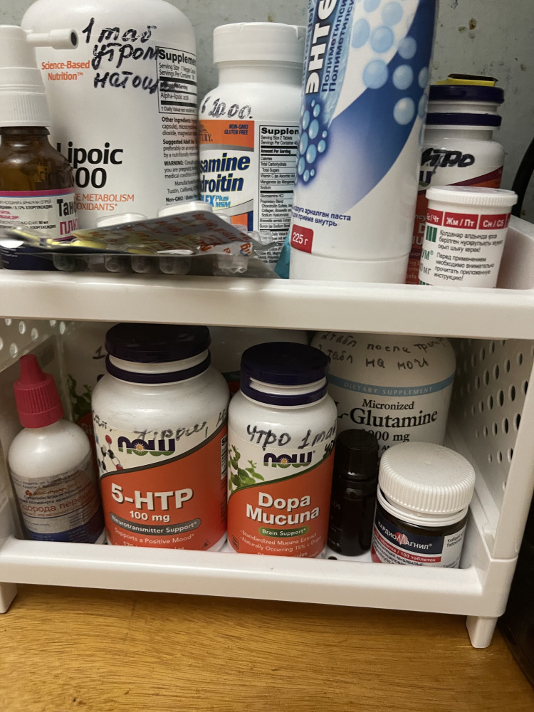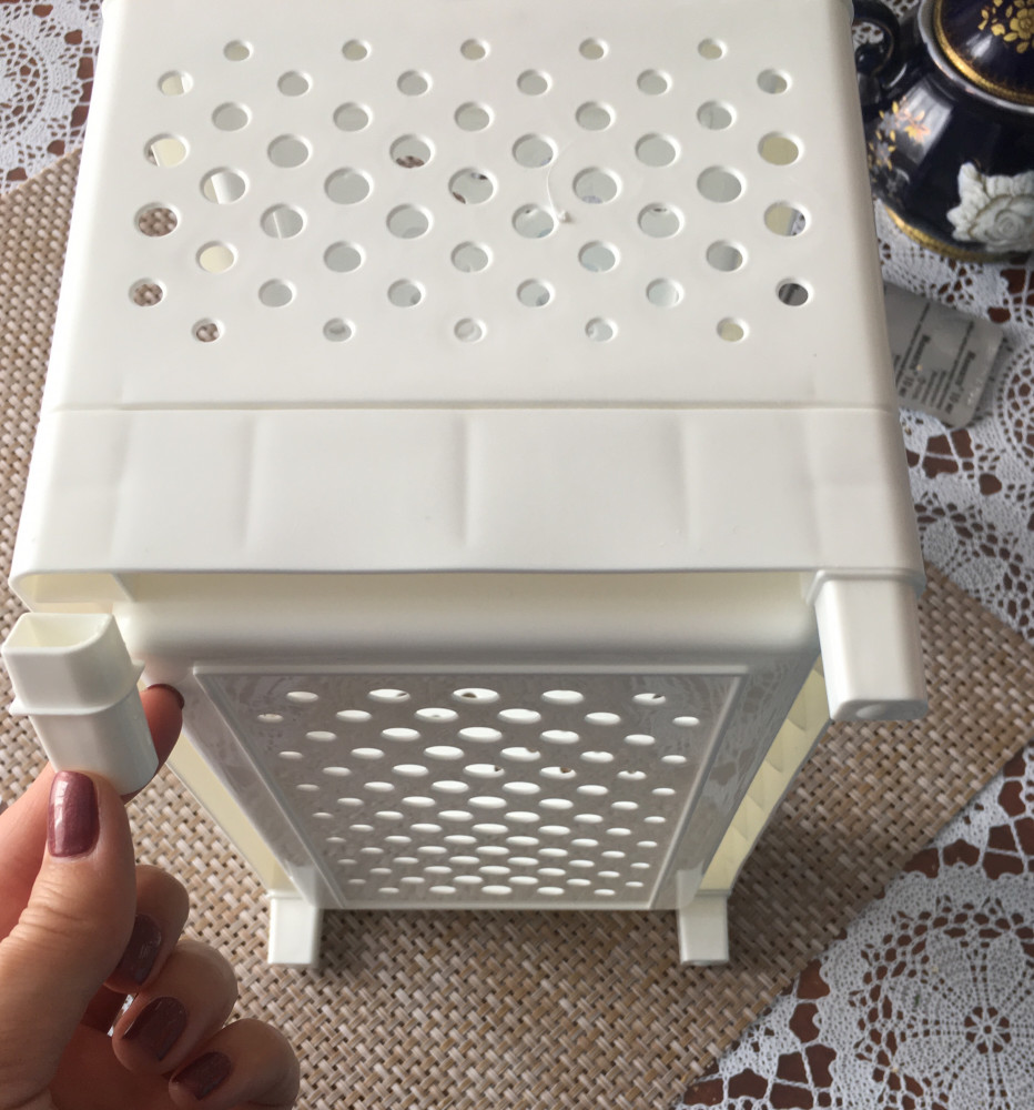 Хотелось бы, чтобы высоких стенок было не две, а четыре. Тогда можно было бы без проблем ставить много ярусов друг на друга. Купила два набора, соединила в одну, теперь у этажерки три этажа и одна полочка запасная (лишняя). Каждый последующий набор будет добавлять только один этаж и еще одну лишнюю запасную полочку. Использую для БАДов на столе.