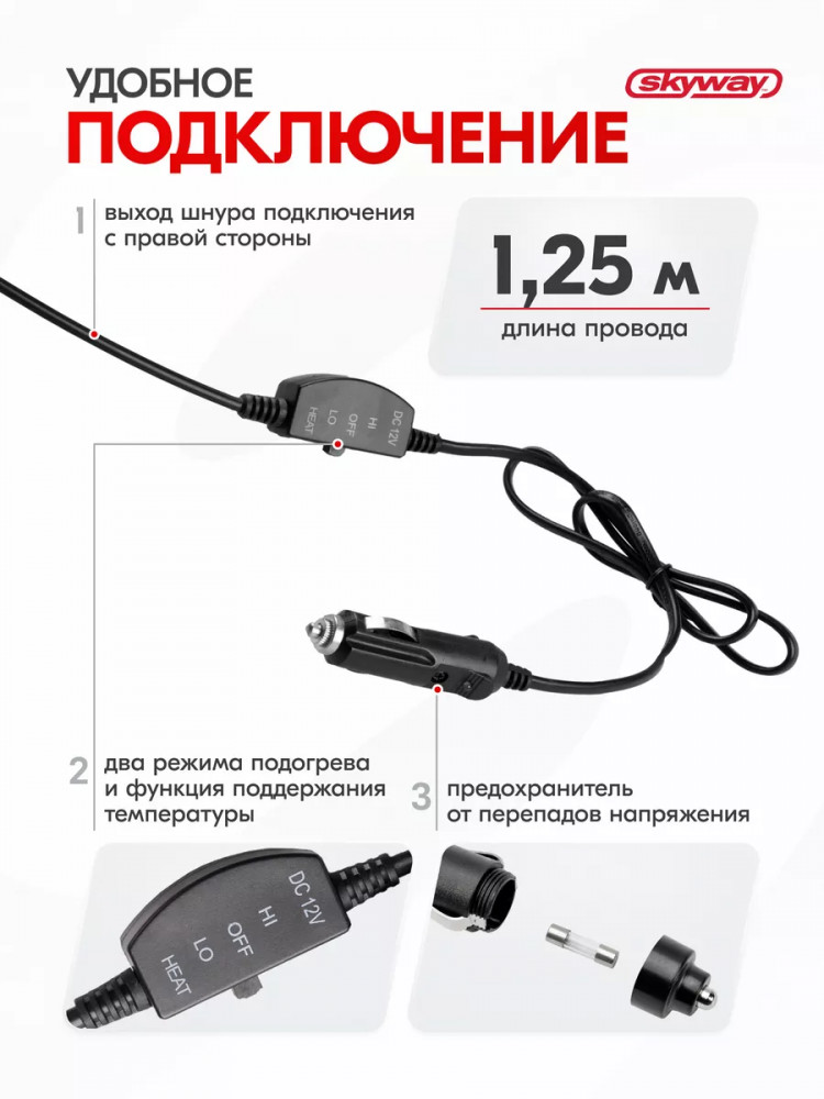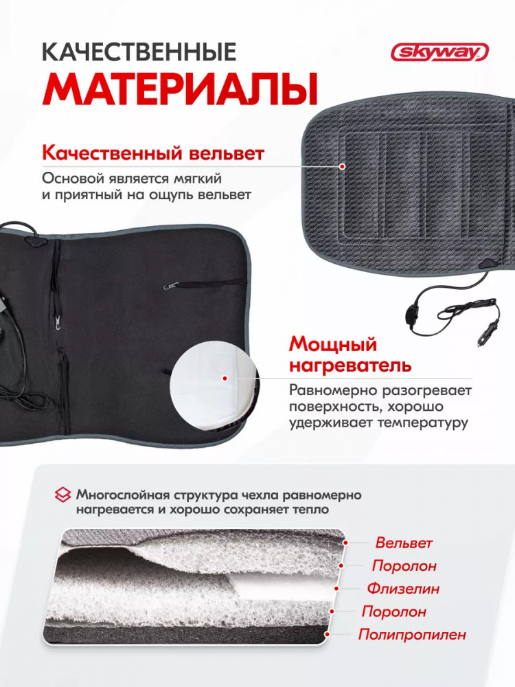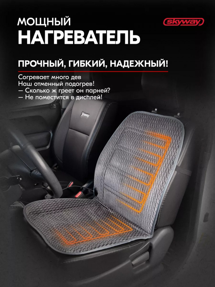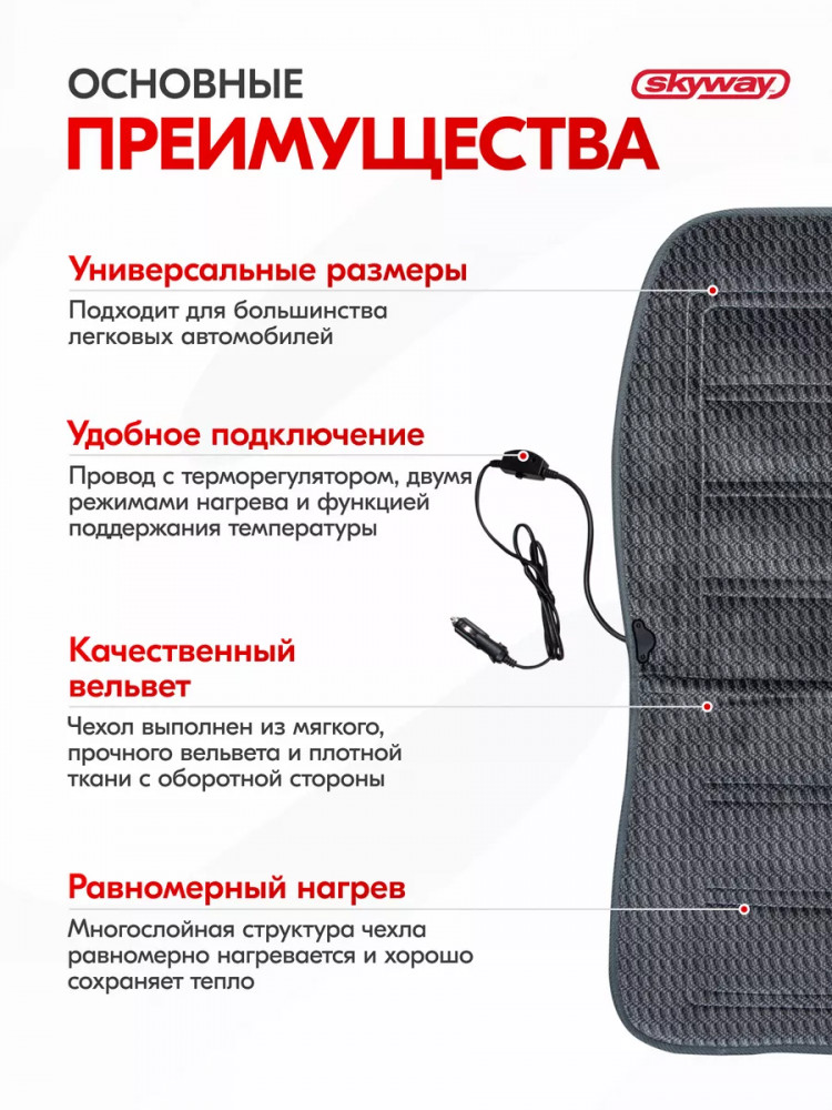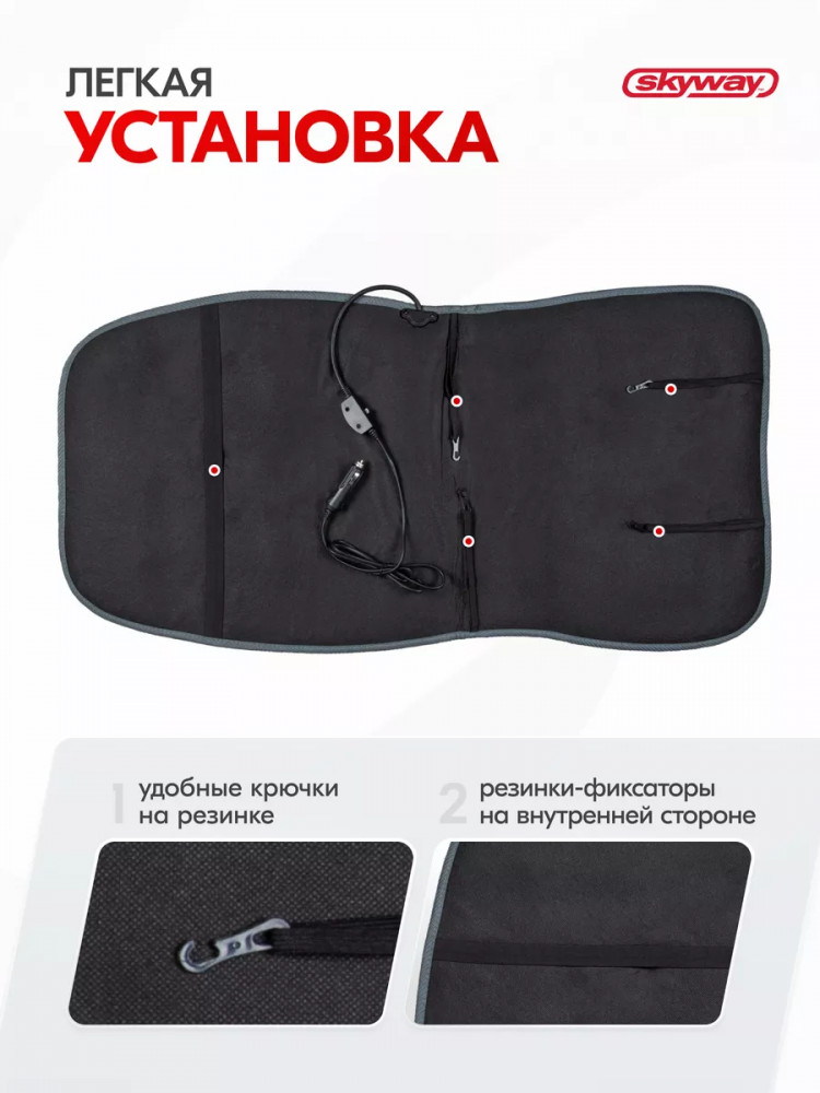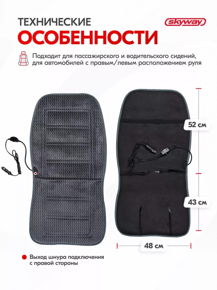 Подогрев сиденья с совершенно новым нагревательным элементом. Вы почувствуете разницу с первой минуты. Быстрый и интенсивный нагрев не заставит Вас долго ждать. Конструкция изделия прочная, имеет универсальный размер и систему крепления, которая позволит использовать аксессуар на различных автомобилях. Внутренняя сторона накидки имеет противозкользящее покрытие, благодаря которому накидку не нужно долго устанавливать и закреплять. Подогрев сиденья подключается к прикуривателю 12В и имеет переходник для использования с правой и левой стороны (подходит для праворукого и леворукого автомобиля). Длина провода-переходника 125 см. Во всех подогревах сиденья в качестве теплоносителя применяется углеродный материал. Такой нагреватель обладает феноменальной гибкостью и прочноситью на разрыв в отличие от аналогов, изготовленных из медного или иного металлического провода.