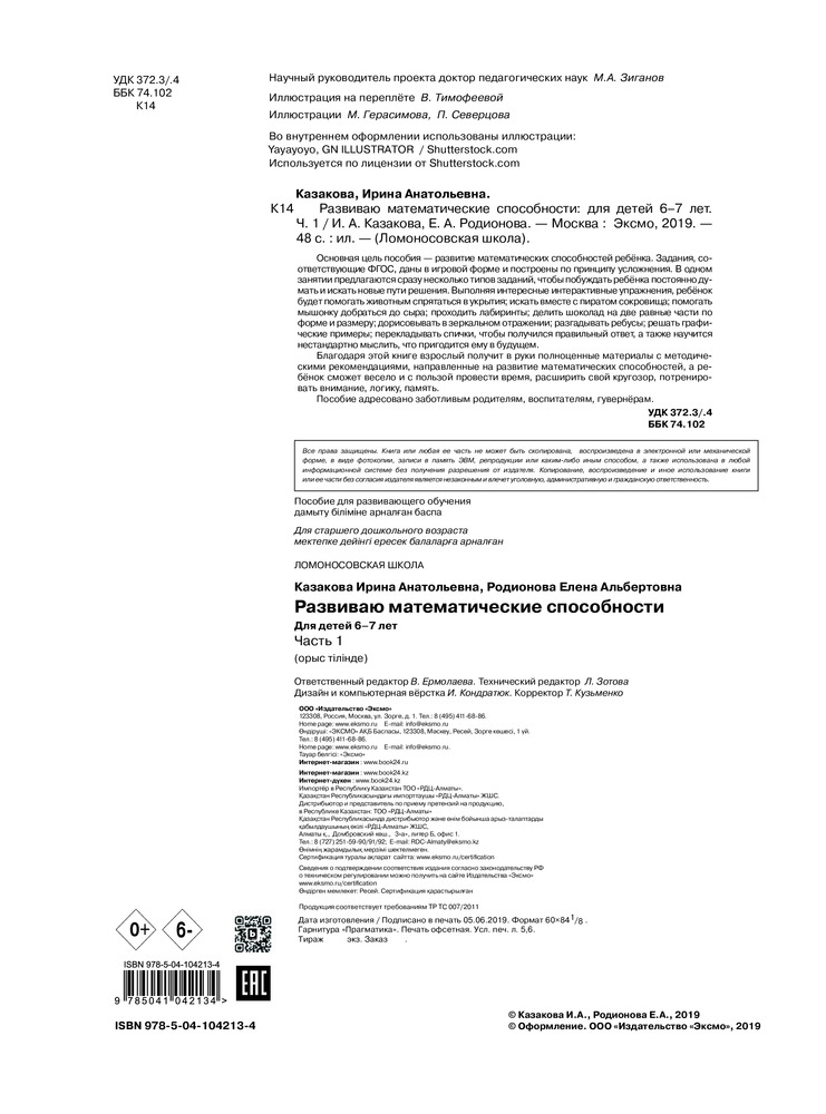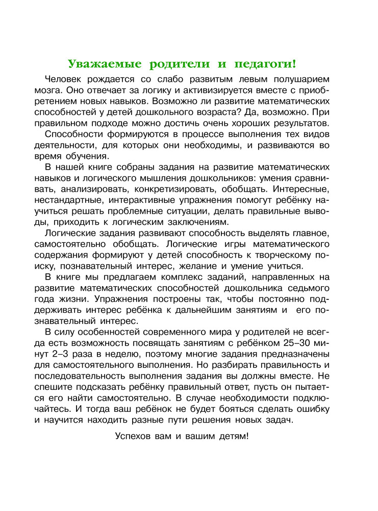 Развиваю математические способности: для детей 6-7 лет. Часть 1Ирина Анатольевна Казакова, Елена Альбертовна Родионова В данный момент этот товар отсутствует в продаже. Возможно, у нас найдется аналогичный или похожий товар здесь. Серия: Ломоносовская школа (обложка) Основная цель пособия — развитие математических способностей ребёнка. Задания, соответствующие ФГОС, даны в игровой форме и построены по принципу усложнения. В одном занятии предлагаются сразу несколько типов заданий, чтобы побуждать ребёнка постоянно думать и искать новые пути решения. Выполняя интересные интерактивные упражнения, ребенок будет помогать животным спрятаться в укрытия; искать вместе с пиратом сокровища; помогать мышонку добраться до сыра; проходить лабиринты; делить шоколад на две равные части по форме и размеру; дорисовывать в зеркальном отражении; разгадывать ребусы; решать графические примеры; перекладывать спички, чтобы получился правильный ответ, а также научится нестандартно мыслить, что пригодится ему в будущем. Благодаря этой книге, взрослый получит в руки полноценные материалы с методическими рекомендациями, направленные на развитие математических способностей, а ребёнок сможет весело и с пользой провести время, расширить свой кругозор, потренировать внимание, логику, память. Пособие адресовано заботливым родителям, воспитателям, гувернерам. |