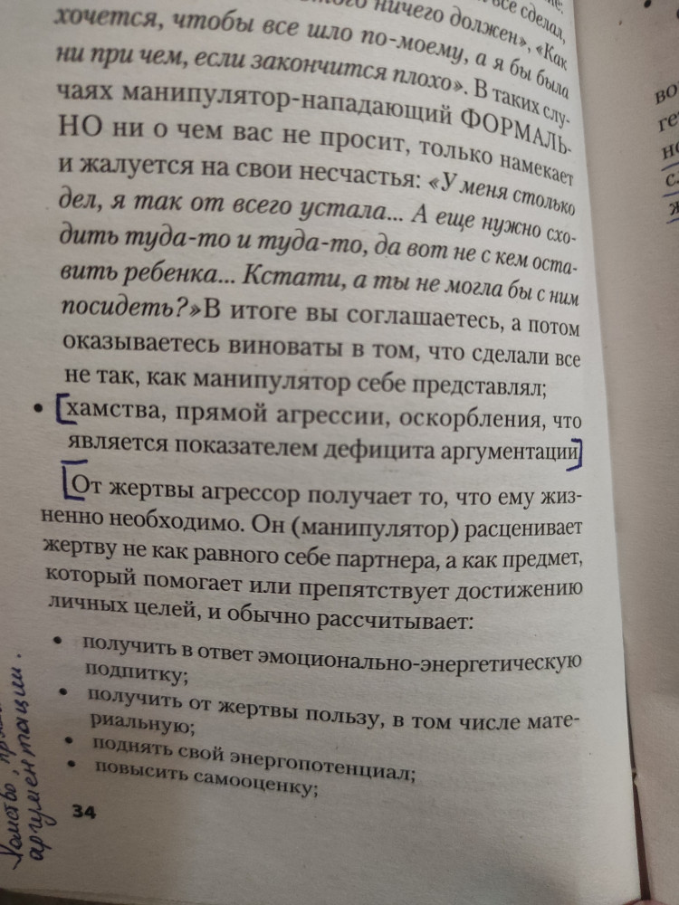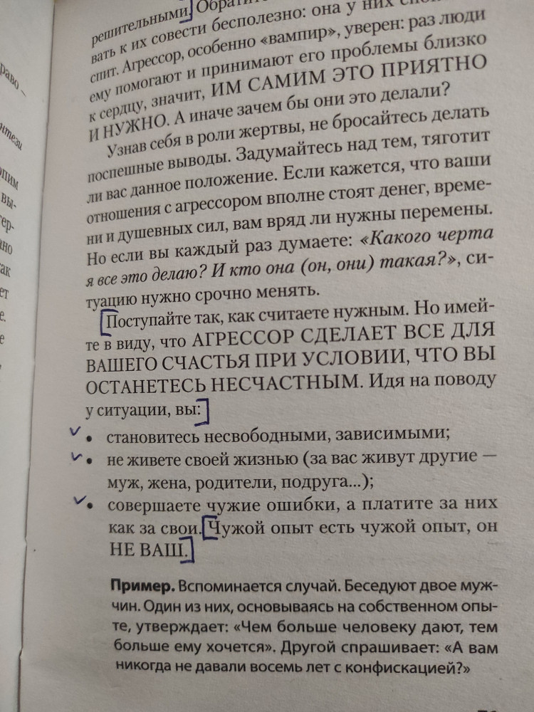 Книга даёт описание + примеры + техники взаимодействия людей, психоэнергетики. Раскрывает причины и следствия негатива, кто такой агрессор(манипулятор, энерго "вампир") и его влияние на себя и окружающих, кто то узнает себя, поймет других. Автор напоминает о том, что у каждого человека есть право на самостоятельность и получения личного опыта (особенно в тех случаях, когда окружающие пытаются навязать свое мнение) Рекомендую к прочтению с карандашом))) полезные выдержки пригодятся.