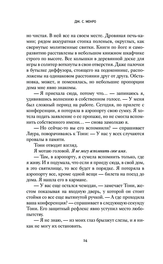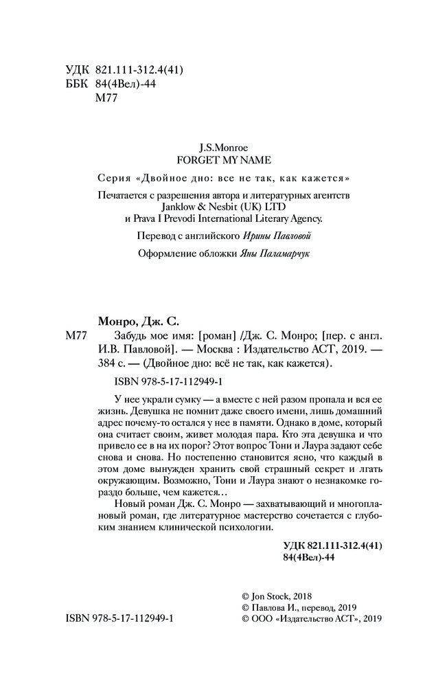 Серия: Двойное дно: всё не так, как кажется У нее украли сумку — а вместе с ней разом пропала и вся ее жизнь. Девушка не помнит даже своего имени, лишь домашний адрес почему-то остался у нее в памяти. Однако в доме, который она считает своим, живет молодая пара. Кто эта девушка и что привело ее в на их порог? Этот вопрос Тони и Лаура задают себе снова и снова. Но постепенно становится ясно, что каждый в этом доме вынужден хранить свой страшный секрет и лгать окружающим. Возможно, Тони и Лаура знают о незнакомке гораздо больше, чем кажется... Новый роман Дж. С. Монро — захватывающий и многоплановый роман, где литературное мастерство сочетается с глубоким знанием клинической психологии. |
