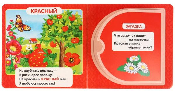 В книге всего пять цветов, но ребенку интересно рассматривать картинки и открывать окошки