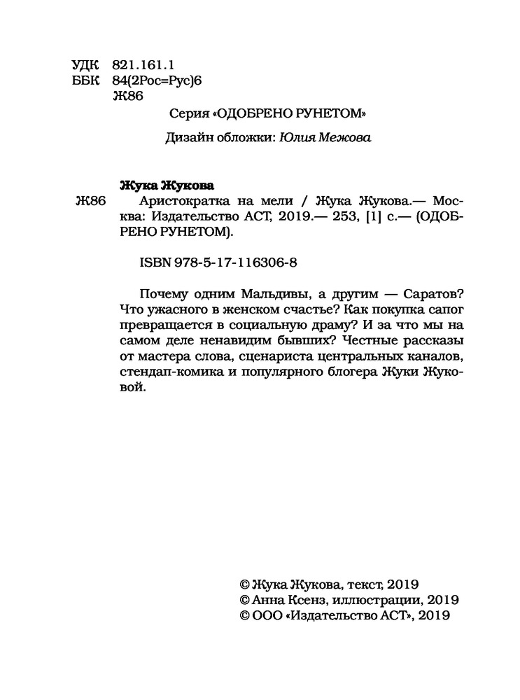 Серия: Одобрено Рунетом Почему одним Мальдивы, а другим — Саратов? Что ужасного в женском счастье? Как покупка сапог превращается в социальную драму? И за что мы на самом деле ненавидим бывших? Честные рассказы от мастера слова, сценариста центральных каналов, стендап-комика и популярного блогера Жуки Жуковой. |