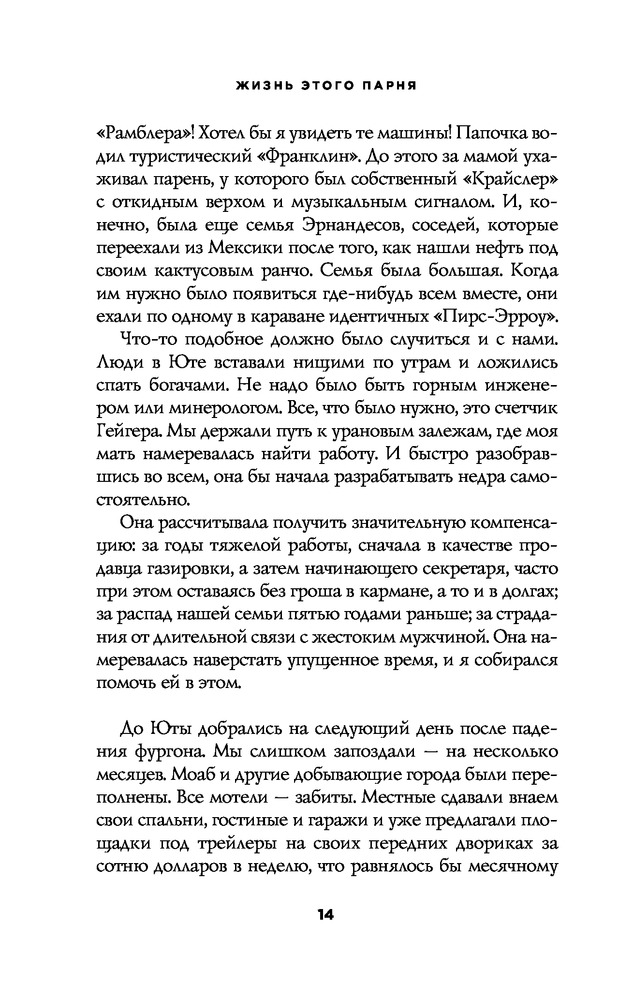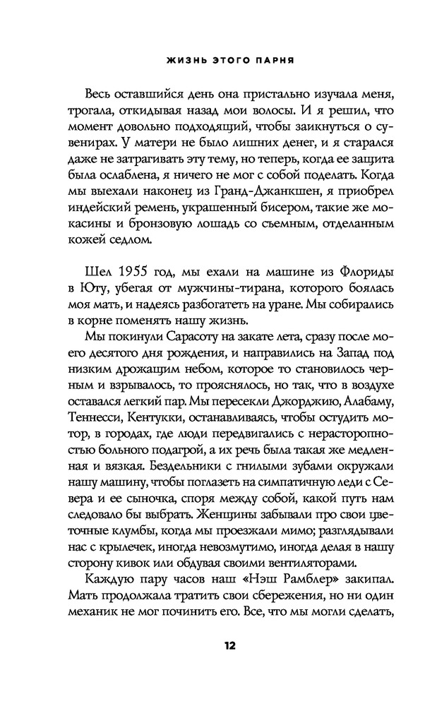 Оценку ставлю за качество книги. Твердый переплет, страницы приятны для чтения и не режут глаз. Ну а по содежанию, книга явно на любителя. Скажу откровенно - очень скучная. Описываются 2-3 года(вроде) жизни мальчика и его мамы. Как их не ценит и не уважает ни один мужчина. У мальчика появляется отчим, который его избивает и всячески издевается. Конечно это ужасно, ни в коем случае не приуменьшаю через что прошел автор и миллионы детей по всему миру. Да и сами мы не росли в здоровых семьях. Но все же читать книгу я бы не советовала, ну очень уж нудно. Хотя, мысли подростка переданы просто замечательно.