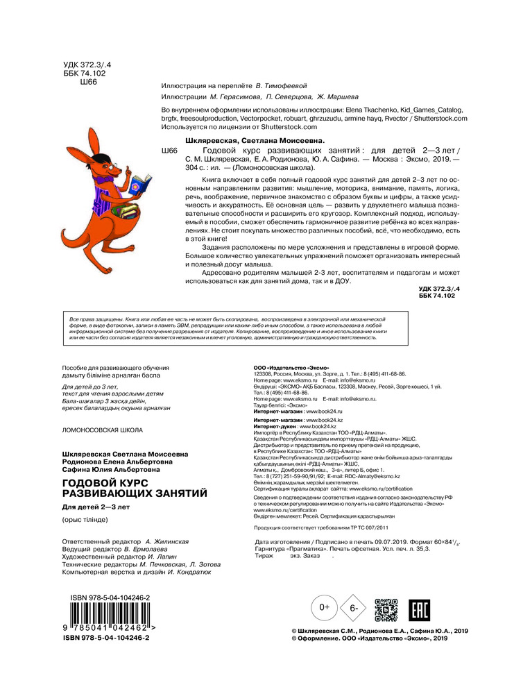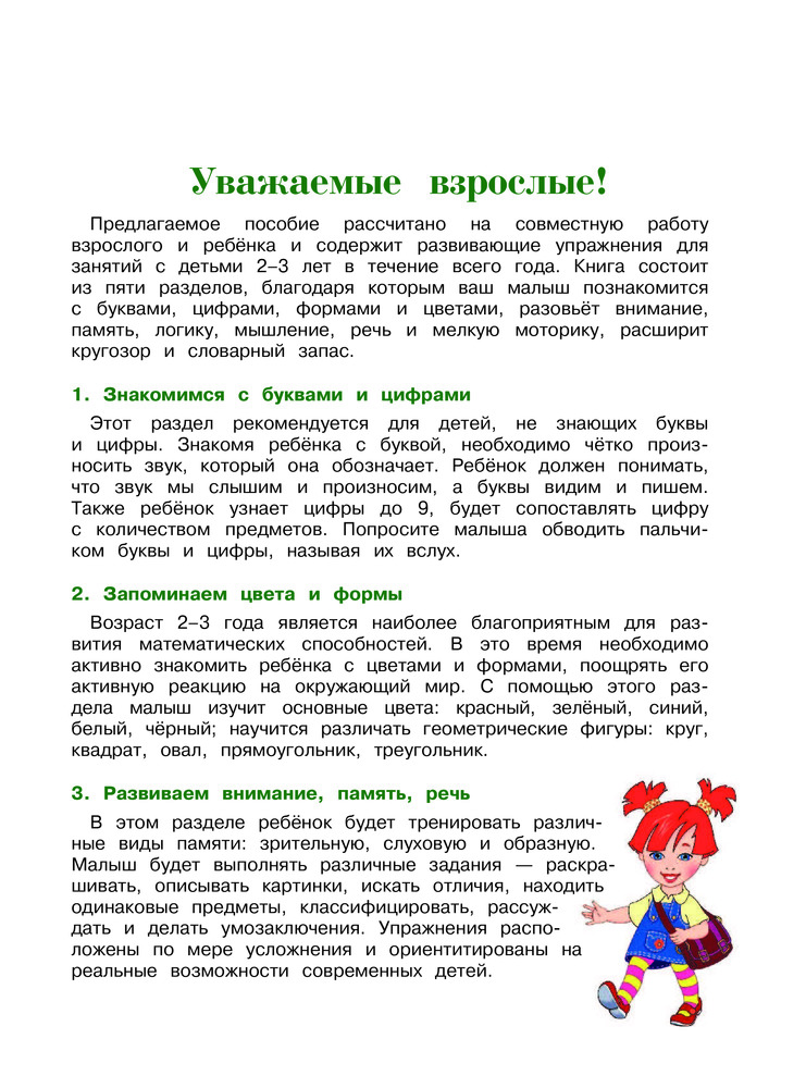 💳 Оплатить за товар можно при получении 🇰🇿 Есть бесплатная доставка по Казахстану от 1 дня 🎁 Копите бонусы с каждой покупки Серия: Ломоносовская школа Книга включает в себя полный годовой курс занятий для детей 2-3 лет по основным направлениям развития: мышление, моторика, внимание, память, логика, речь, воображение, первичное знакомство с образом буквы и цифры, а также усидчивость и аккуратность. Её основная цель — развить у двухлетнего малыша, познавательные способности и расширить его кругозор. Комплексный подход, используемый в пособии, сможет обеспечить гармоничное развитие ребенка во всех направлениях. Не стоит покупать множество различный пособий, всё что необходимо есть в этой книге! Задания, расположенные по мере усложнения и представлены в игровой форме. Большое количество увлекательных упражнений поможет организовать интересный и полезный досуг малыша. Адресовано родителям малышей 2-3 лет, воспитателям и педагогам и может использоваться, как для занятий дома, так и в ДОУ. |