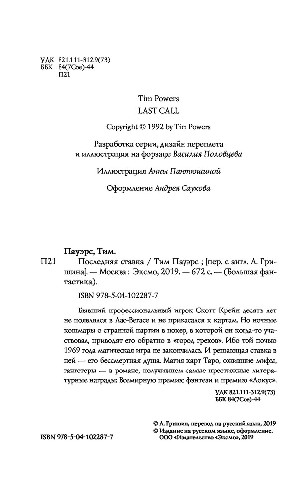💳 Оплатить за товар можно при получении 🇰🇿 Есть бесплатная доставка по Казахстану 🎁 Копите бонусы с каждой покупки Серия: Большая фантастика Бывший профессиональный игрок Скотт Крейн десять лет не появлялся в Лас-Вегасе и не прикасался к картам. Но ночные кошмары о странной партии в покер, в которой он когда-то участвовал, приводят его обратно в «город грехов». Ибо той ночью 1969 года магическая игра не закончилась. И решающая ставка в ней — его бессмертная душа. Магия карт Таро, ожившие мифы, гангстеры — в романе, получившем самые престижные литературные награды: Всемирную премию фэнтези и премию «Локус». |