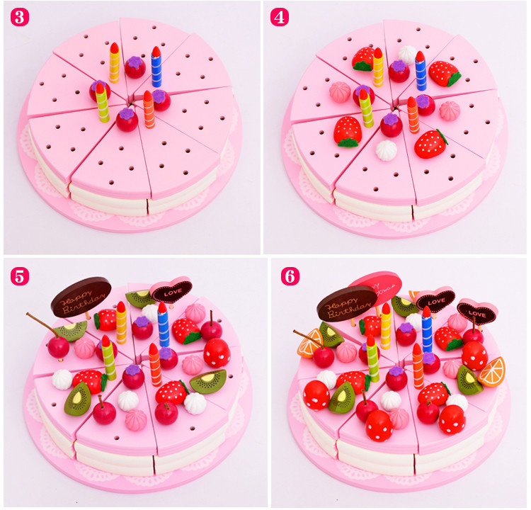 В коробке с тортом Вы найдете множество элементов для украшения: свечки, праздничные надписи, ягоды, кусочки фруктов, фигурки из «шоколада» и «печенья». Ко всем элементам украшения снизу приделаны тоненькие палочки, эти палочки вставляются в отверстия на торте, таким образом и происходит процесс украшения. На каждом куске торта есть отверстии.
