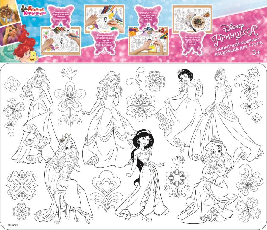 Многофункциональный коврик-раскраска защитит поверхность стола от загрязнений и царапин: просто постелите его на обеденный или рабочий стол вашего ребенка. Сказочные персонажи любимых мультфильмов от Disney увлекут малыша процессом раскрашивания. Раскрашивать картинки можно цветными карандашами или фломастерами — тогда раскраску можно будет использовать снова. Просто удалите карандаш ластиком, а фломастер — влажной салфеткой, и раскраска снова готова к использованию.