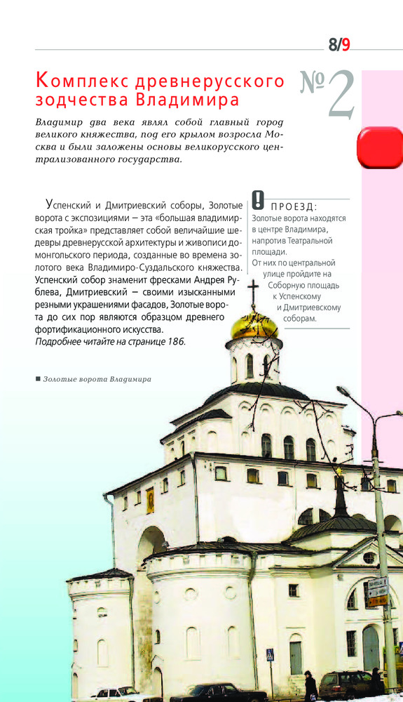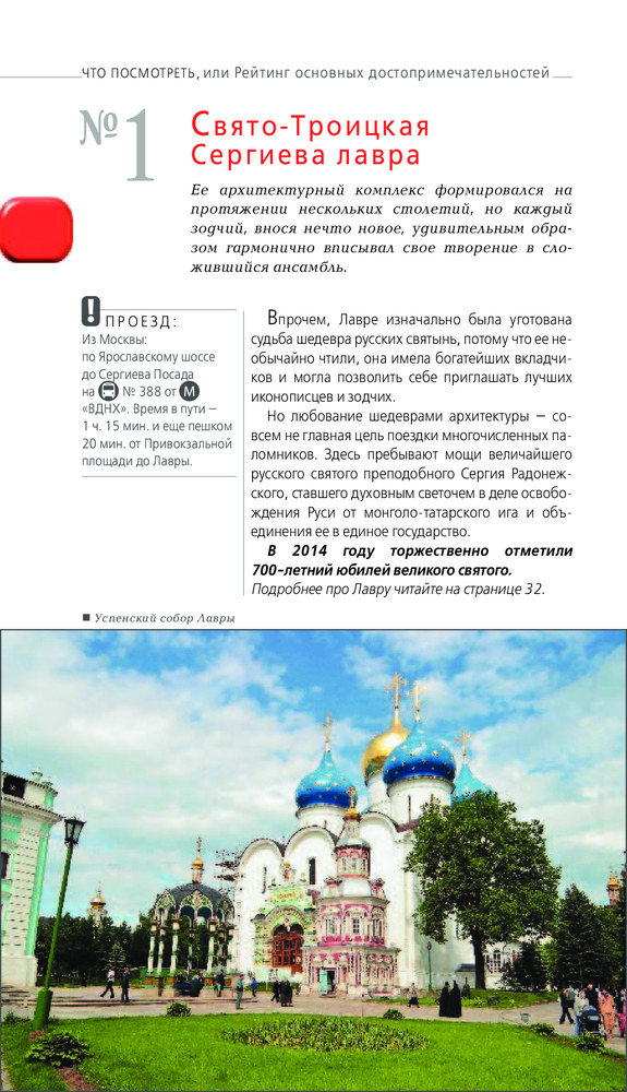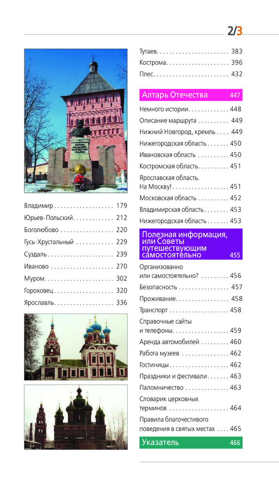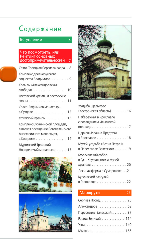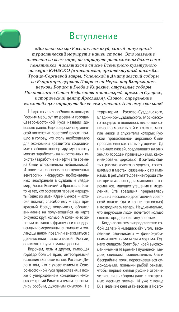 Обновленный путеводитель по Золотому Кольцу - прекрасный подарок молодоженам, семейным юбилярам и… иностранцам, а также ВСЕМ, кто интересуется историей России. Содержание книги в точности соответствует ее названию - "Золотое Кольцо". И подача темы существенно отличается от традиционных путеводителей, более похожих на «каталоги достопримечательностей». Концепция «Orangевого гида» - предложение уже готовых маршрутов (город за 2 часа, за один день за два дня…) и их пошаговое описание. Новое «Золотое Кольцо» - это книга о любви к ближним в самом разнообразном понимании этого слова. Во-первых, это любовь человека к человеку, и соответственно в книге много информации о семейных традициях. Другая ипостась любви к ближнему – это любовь к родине, патриотизм, воинский подвиг при защите Родины. Что касается практического содержания, в книге приведено много новых советов и информации, где и как провести свой медовый месяц (и даже зарегистрировать свой брак), где отпраздновать (путешествуя) свой семейный свадебный юбилей - "деревянный", "оловянный", "серебряный", "золотой"... Так что путешествовать по Кольцу можно начинать с раннего детства, чтобы узнать, как готовили приданое, как сватались, женились, воспитывали детей, покоили старость родителей, защищали Родину, строили храмы – памятники воинским подвигам предков... Особо отмечены юбилеи 2010 г.: 1000-летие Ярославля, 600-летие Плеса и грядущие: 1150-летие Мурома, 400-летие победы ополчения Минина и Пожарского и предшествовавшие ей другие события Смутного времени. Предложены варианты «туристского» проведения новых государственных праздников: Дня народного единства (4 ноября) и Дня любви, семьи и верности (8 июля). Во 2-м переиздании добавлены или даны подробнее маршруты: «На вотчину князя Дм.Пожарского» (окрестности Иваново), «Переславль – родина Александра Невского», «К святым покровителям православного брака cупругам князьям Петру и Февронии», по окрестностям Сергиева Посада (на св. источники (Малинники и др.) и к месту венчания Федора Шаляпина и Иолы Торнаги), по окрестностям Ярославля и Иваново (путешествие к героям русских народных сказок, на родину народных промыслов Палех, Холуй). Новинки: Информация о народных свадебных обрядах в игровых программах музеев и турфирм. Информация о наличии в средствах размещения SPA- комплексов, эксклюзивных предложений (в т.ч. номера для молодоженов). Календари некоторых православных крестных ходов. Электронные технологии (on-line бронирование, безопасность эл. платежей, азы финансовой грамотности и пр.) Прокат автомобилей, в Москве и на маршруте, а также конных экипажей и пр. Маршруты популярных авторалли.