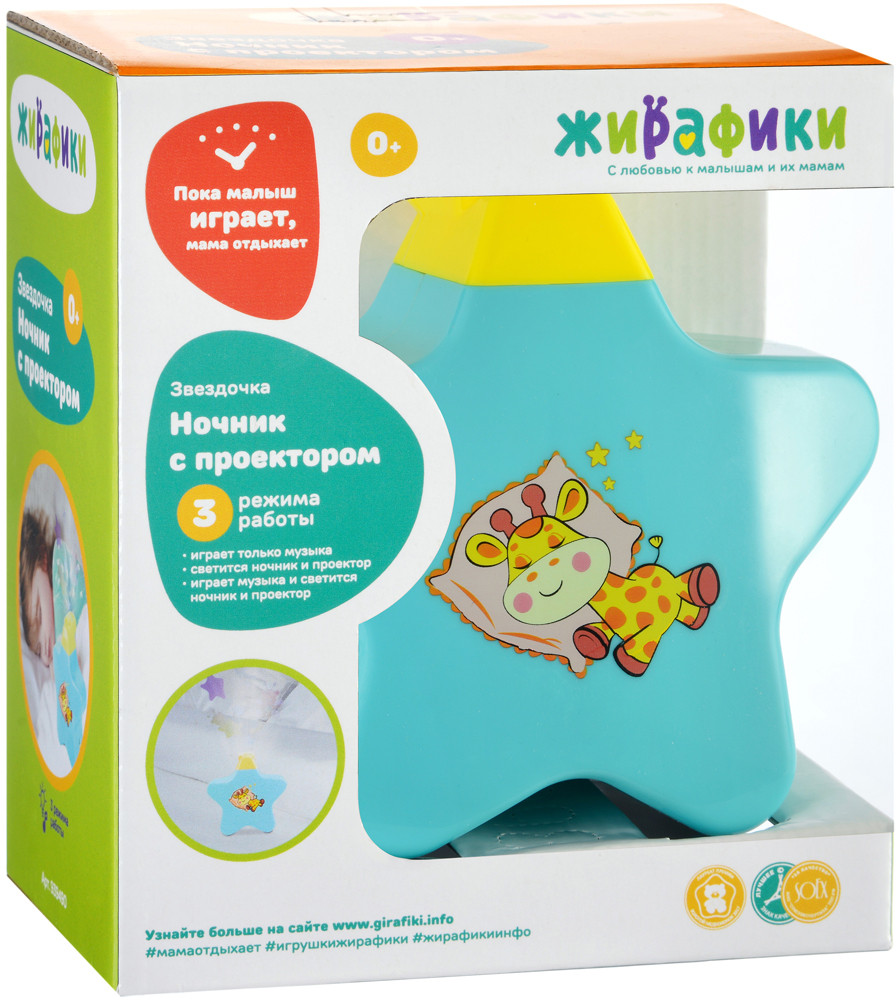 Жирафики Ночник с проектором «Звездочка»В данный момент этот товар отсутствует в продаже. Возможно, у нас найдется аналогичный или похожий товар здесь. В свете проектора, отраженном на потолке, малыш увидит милых персонажей, медленно плывущих по кругу. Это небольшое волшебное представление успокоит маленького непоседу и поможет ему заснуть. Ночник работает в трех режимах: «музыка без света», «свет без музыки» и «свет с музыкой». |
