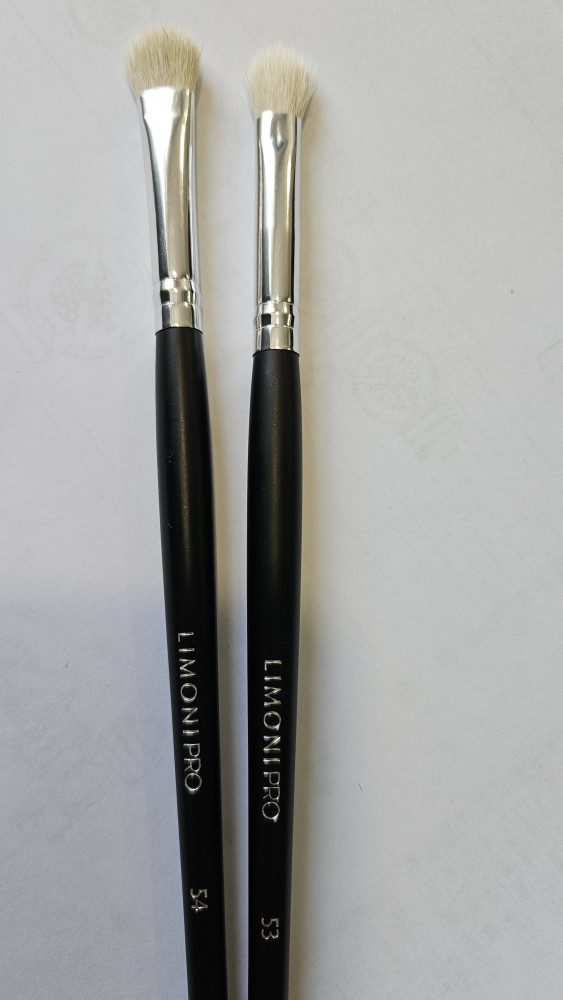 По сравнению с кистью #54, покруглее и поменьше. Обе прекрасно подходят для нанесения основного цвета теней.