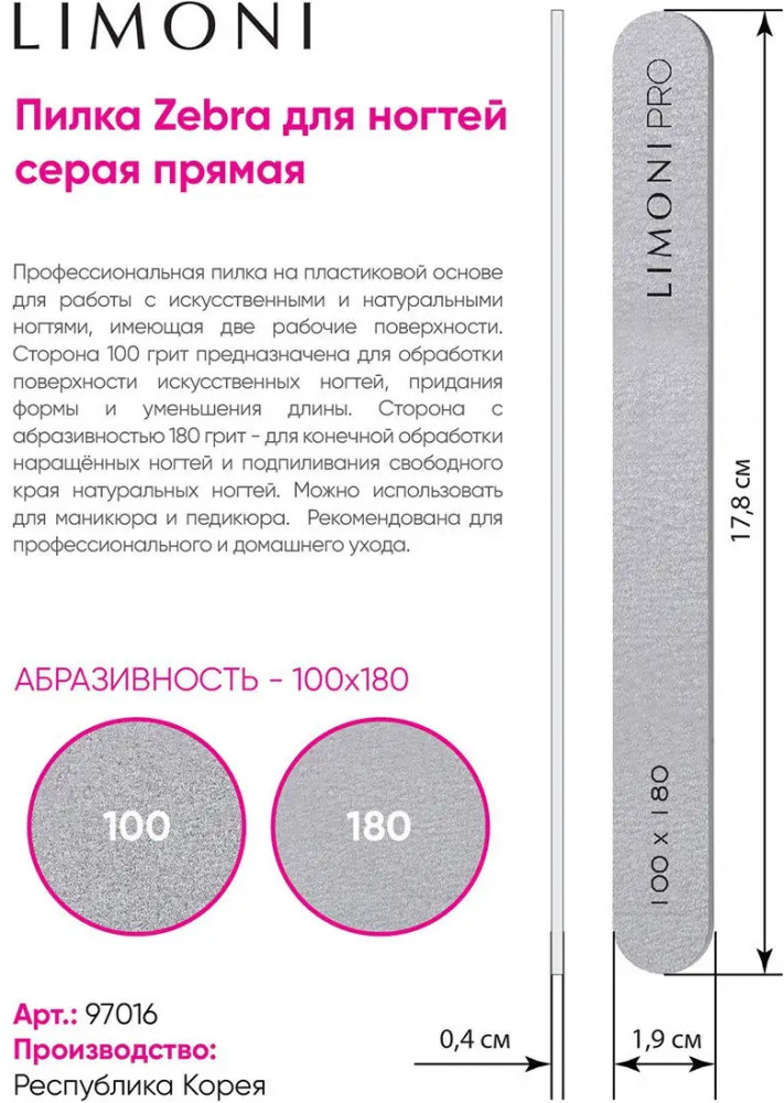 Limoni Пилка для ногтей «Зебра» прямая-35% +37 удобная жесткая компактность качество эстетичность