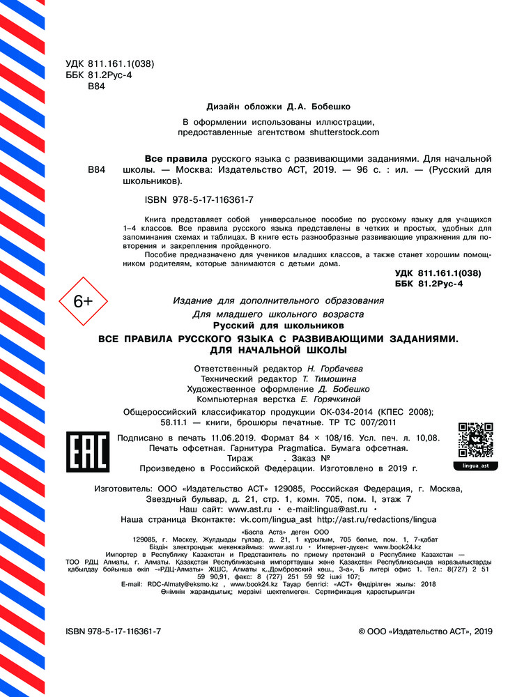Все правила русского языка с развивающими заданиями. Для начальной школыВ данный момент этот товар отсутствует в продаже. Возможно, у нас найдется аналогичный или похожий товар здесь. Серия: Русский для школьников Книга представляет собой универсальное пособие по русскому языку для учащихся 1-4 классов. Все правила русского языка представлены в четких и простых, удобных для запоминания схемах и таблицах. Каждая тема завершается разнообразными развивающими упражнениями для повторения и закрепления пройденного. Пособие предназначено для учеников младших классов, а также станет хорошим помощником родителям, которые занимаются с детьми дома. |