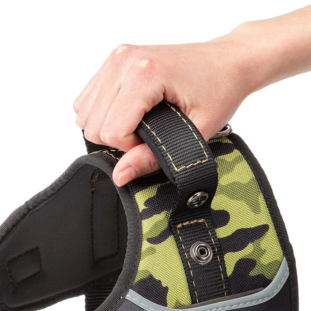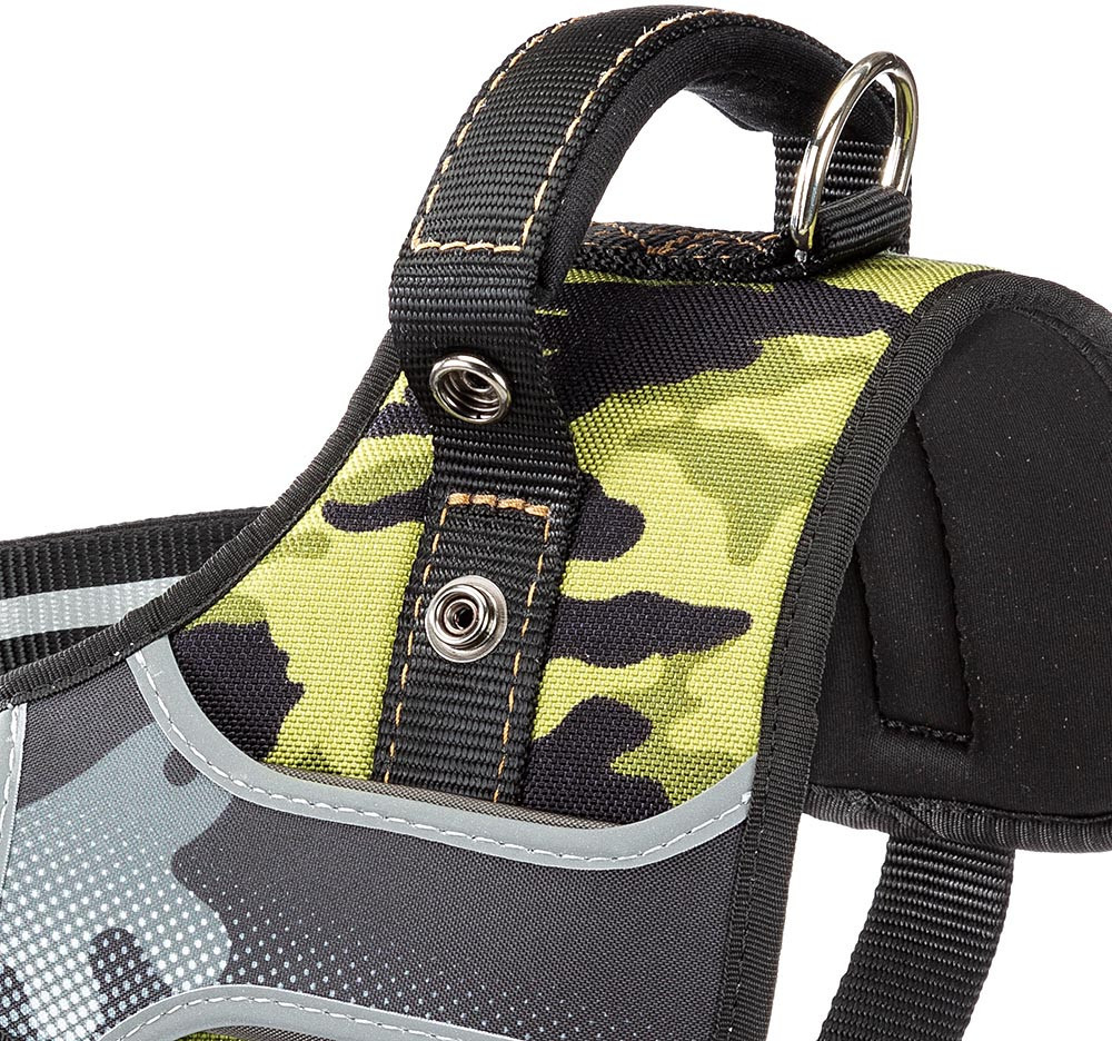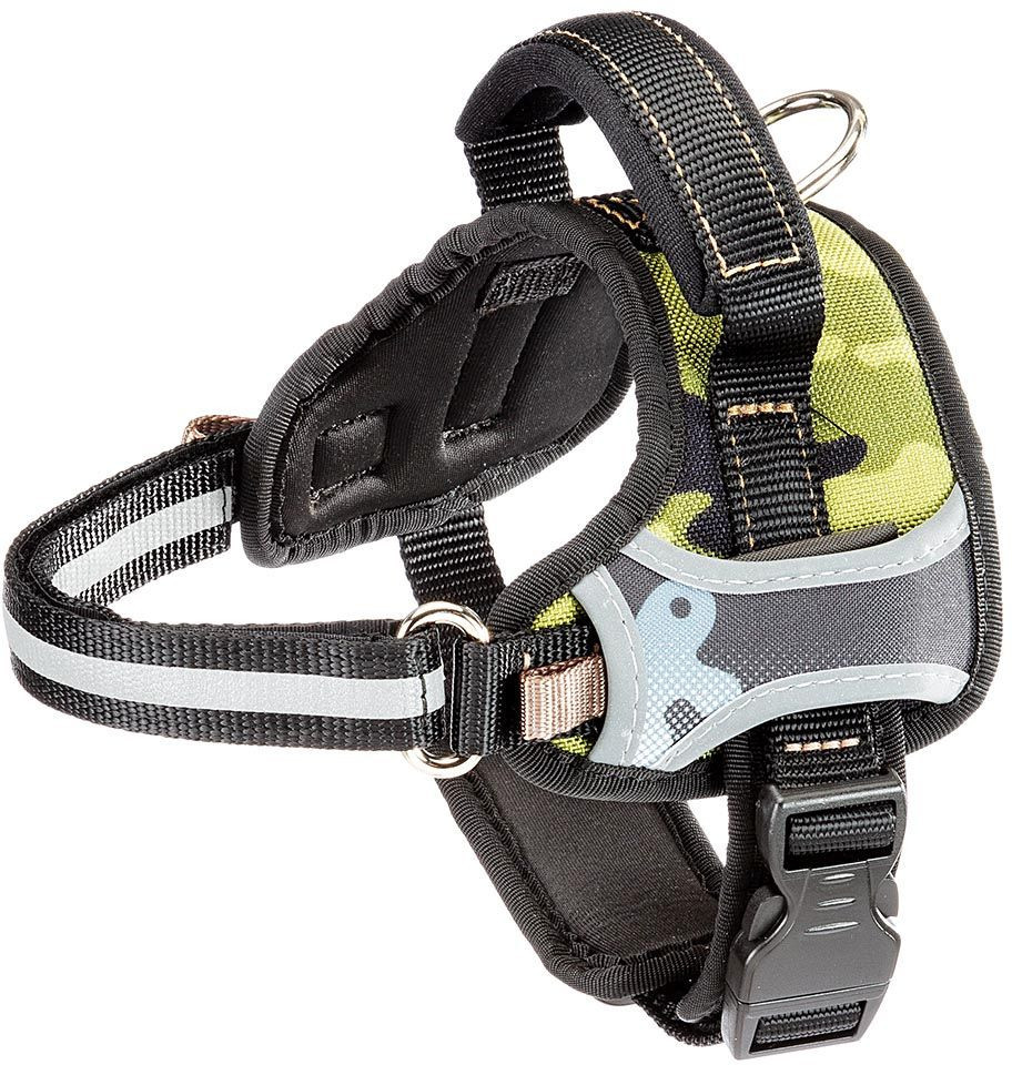 Нейлоновая шлейка для собак с дополнительной мягкой подкладкой на спине и по бокам. Сверху мягкая ручка для большего контроля поведения собаки в людных местах, но для поводка предусмотрено крепкое стальное кольцо.