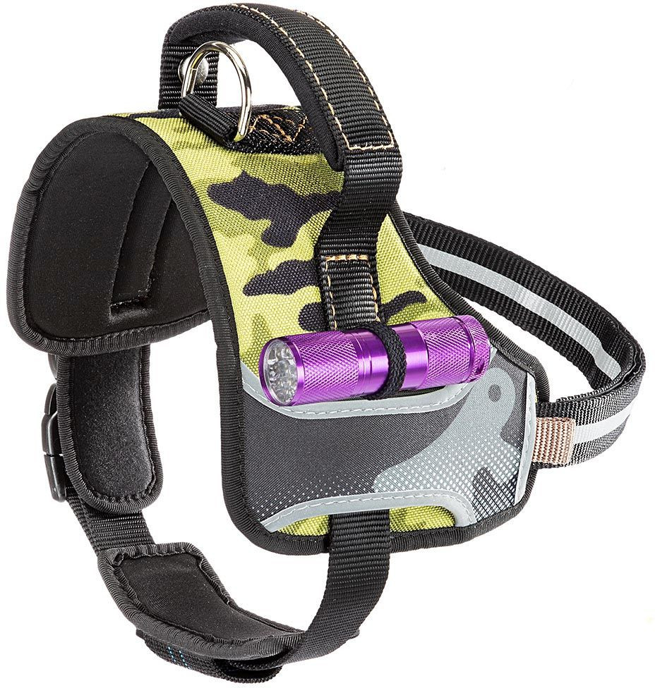 Материал — прочный нейлон. Нижний ремешок имеет мягкую поролоновую прокладку. Двойной ремешок на груди имеет вшитую полосу светоотражающей отделки, которая используется и в декорирующих элементах по бокам. Использованные материалы не натирают кожу собаки даже при ее активном движении.