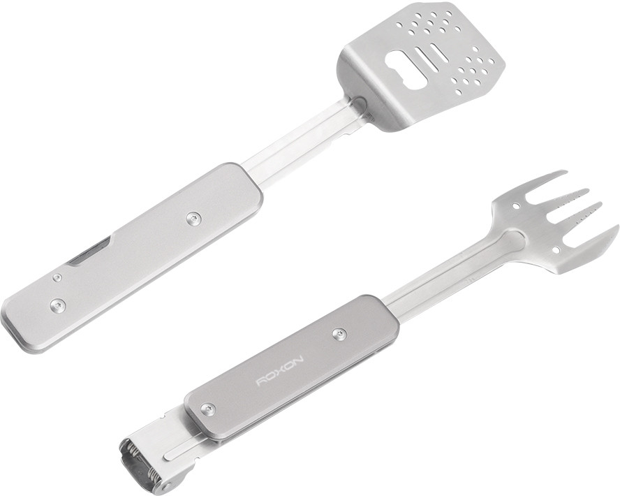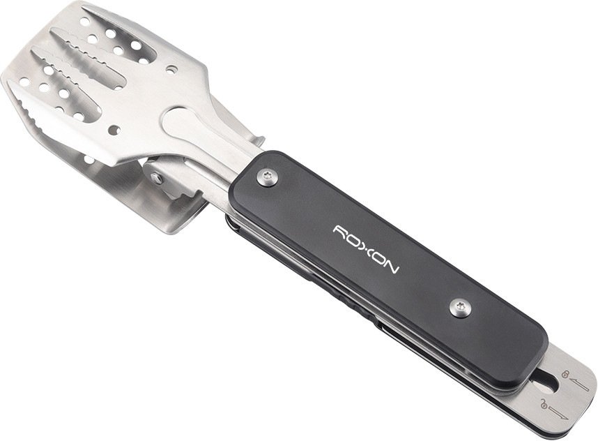 Компактная версия мультиинструмента для приготовления барбекю. Он состоит из металлических лопатки и вилки, которые могут использоваться как самостоятельные инструменты, а вместе образуют удобные щипцы. Кроме того, в инструмент встроена простая открывалка для бутылок.