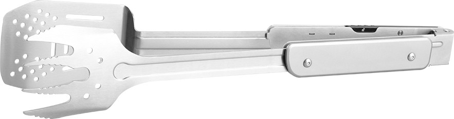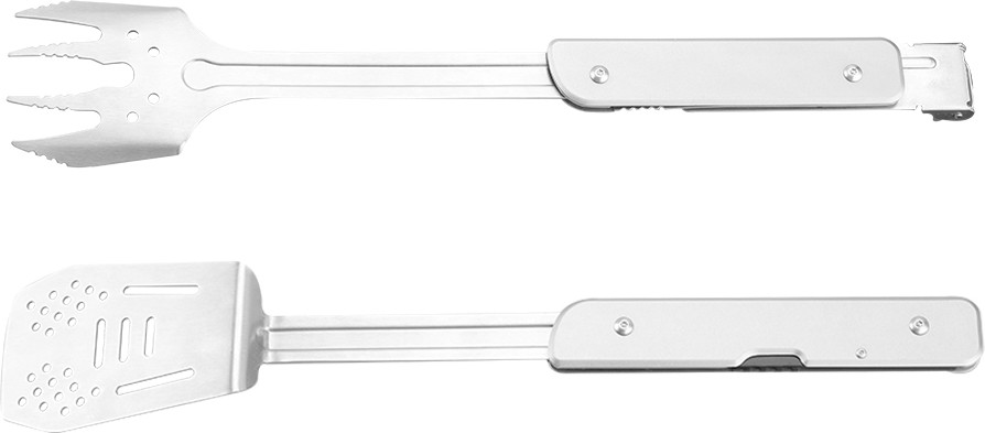 Непосредственно к ножу крепятся лопатка и вилка. Оба инструмента сделаны полностью металлическими, со складной ручкой. У вилки 4 зубчика с зазубринами, чтобы мясо не соскальзывало с нее. Есть отверстия для стекания жира. Такие же отверстия сделаны и на лопатке. Вилку с лопаткой можно соединить таким образом, чтобы они играли роль щипцов. |