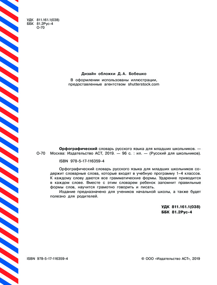 Серия: Русский для школьников Орфографический словарь русского языка для младших школьников содержит словарные слова, которые входят в учебную программу 1-4 классов. К каждому слову даются все грамматические формы. Ударение приводится в каждом слове. Вместе с этим словарем ребенок запомнит правильные формы слов, научится грамотно говорить и писать. Издание предназначено для учеников начальной школы, а также будет полезно для родителей. |